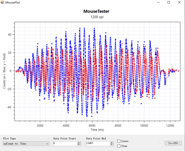 鼠标分散图如上,DPI:1200,垫子:虎符;离散情况还是可以的,起码对得起这个价格。(受影响因素很多,此数据仅供参考)