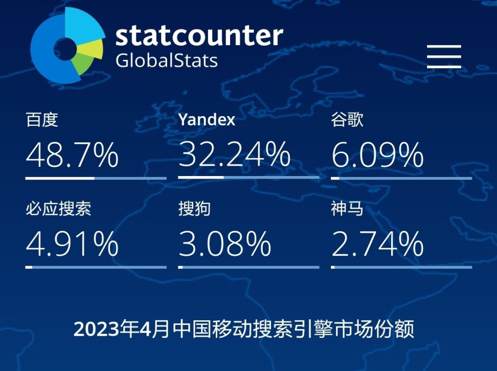 如果你觉得这一切还不够相信的话,国内移动端的统计数据更是让人瞠目结舌。百度占据48.7,而Yandex占据32.24。