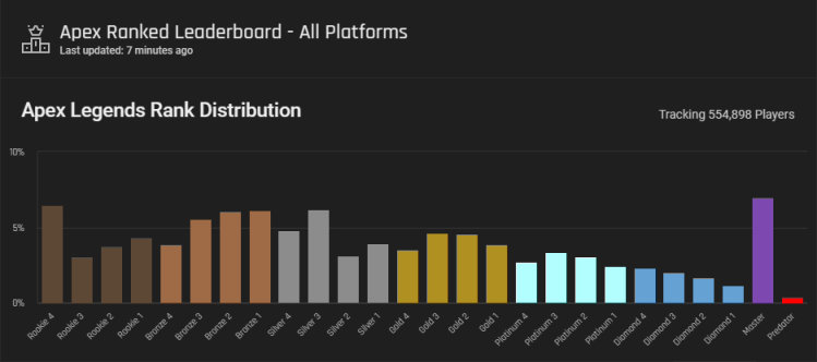 没错,平台只统计了注册平台用户的段位占比。而有些人则是错把平台数据当成所有玩家的数据。真正的段位数据只有APEX官方重生娱乐知道,而游戏公司一般不会把这个数据开放给别人。