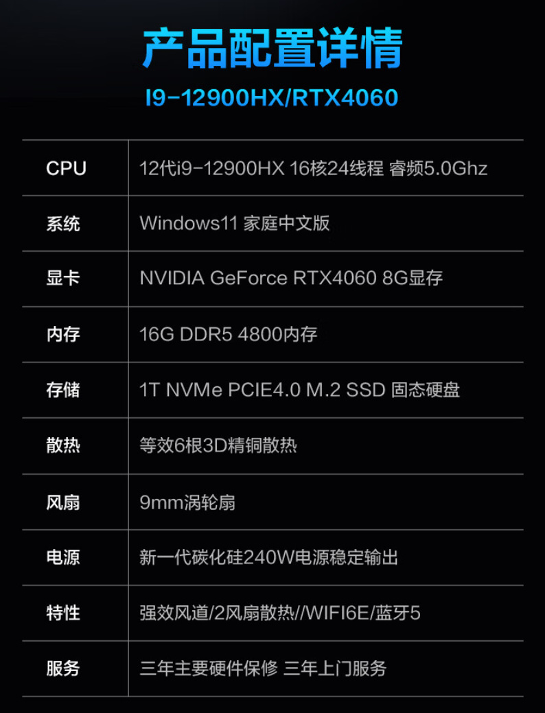 该机配有六铜管、双风扇散热,以及 16GB 双通道 DDR5 4800 内存 + 1TB PCIe 4.0 SSD,可扩展存储,支持 Wi-Fi 6E。