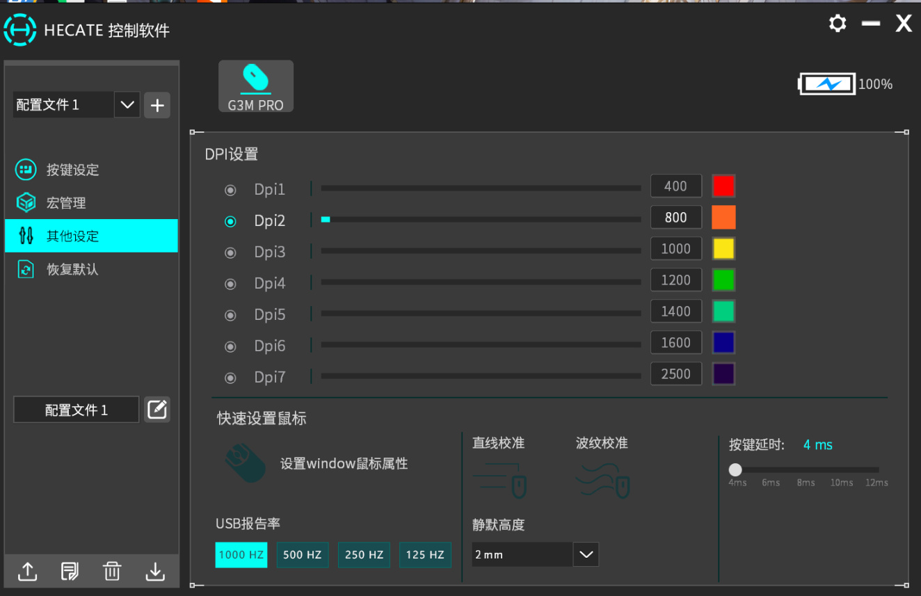 DPI 默认有7档可调 LOD 高度2档可调 回报率4档可调 宏设置方面也可以随心调整