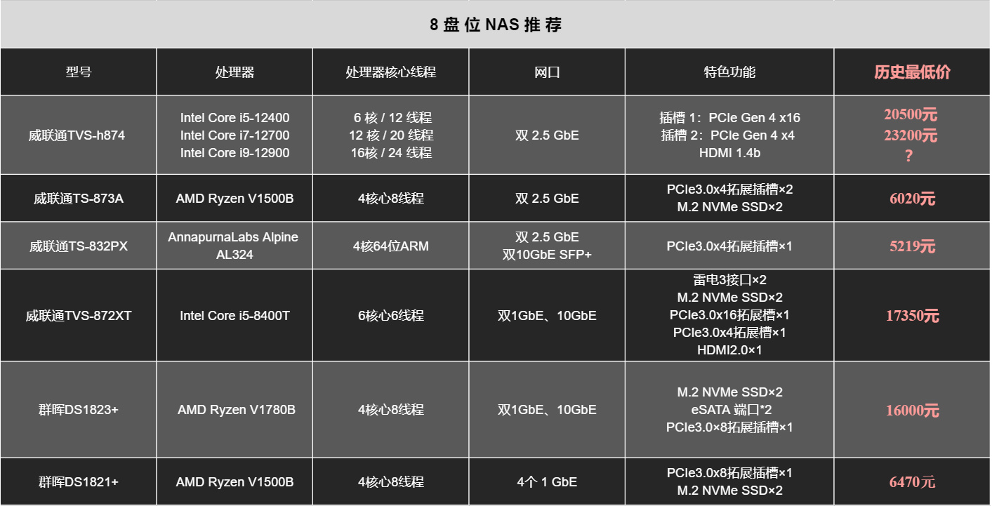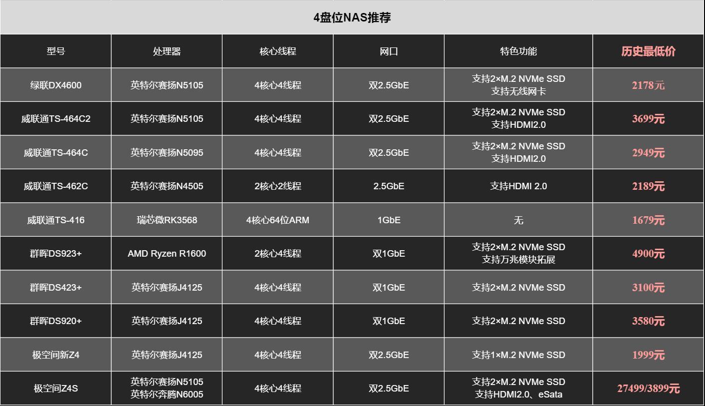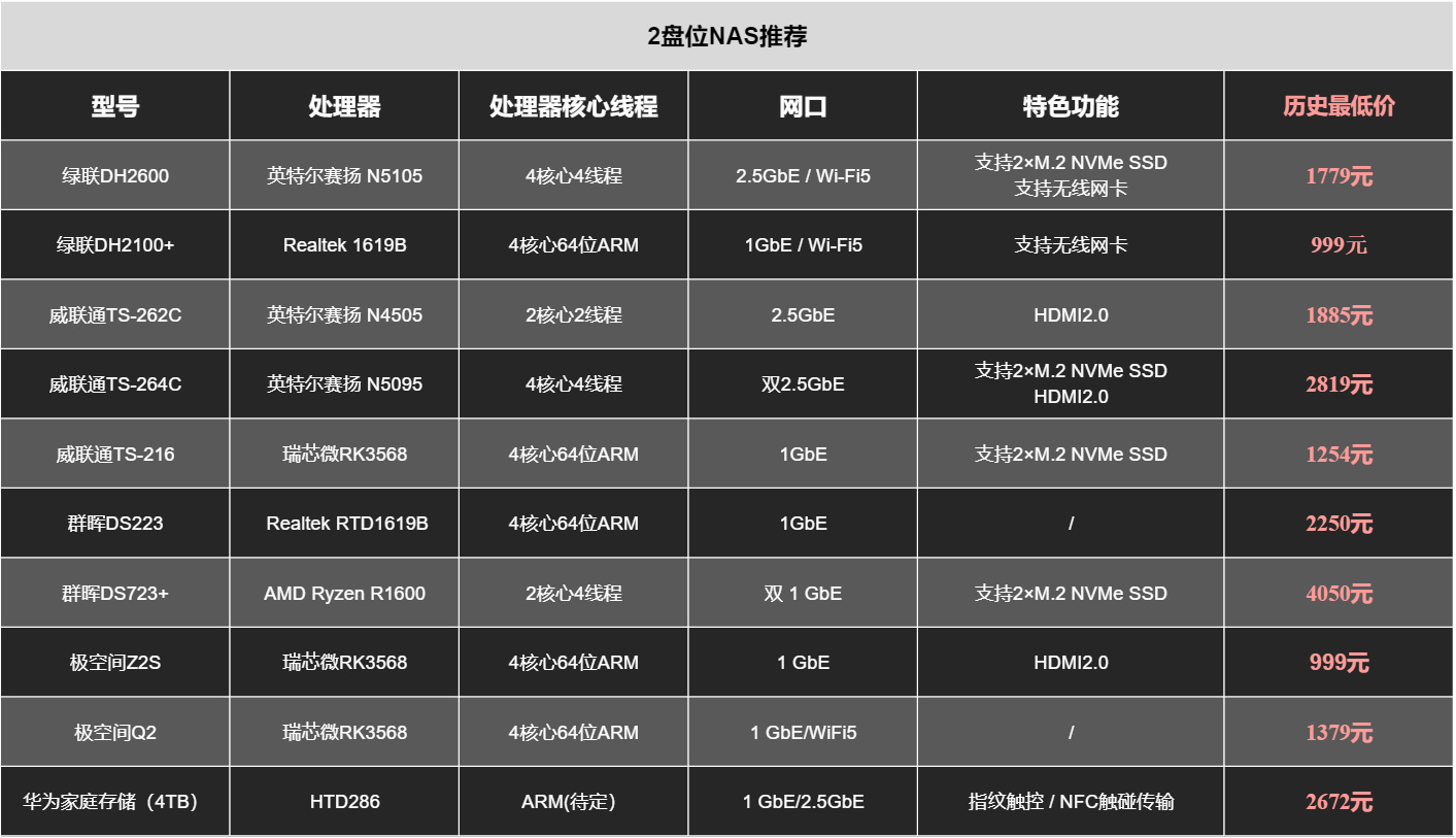 本部分有每个市面上在售NAS产品型号表格,包括有品牌型号,所采用的处理器,网口与它的一些特色功能,同时还会提供过去出现过的历史最低价格,供大家参考,在下方的产品介绍中会根据个人经验针对每个产品进行点评,大家根据自身实际情况选择购买。