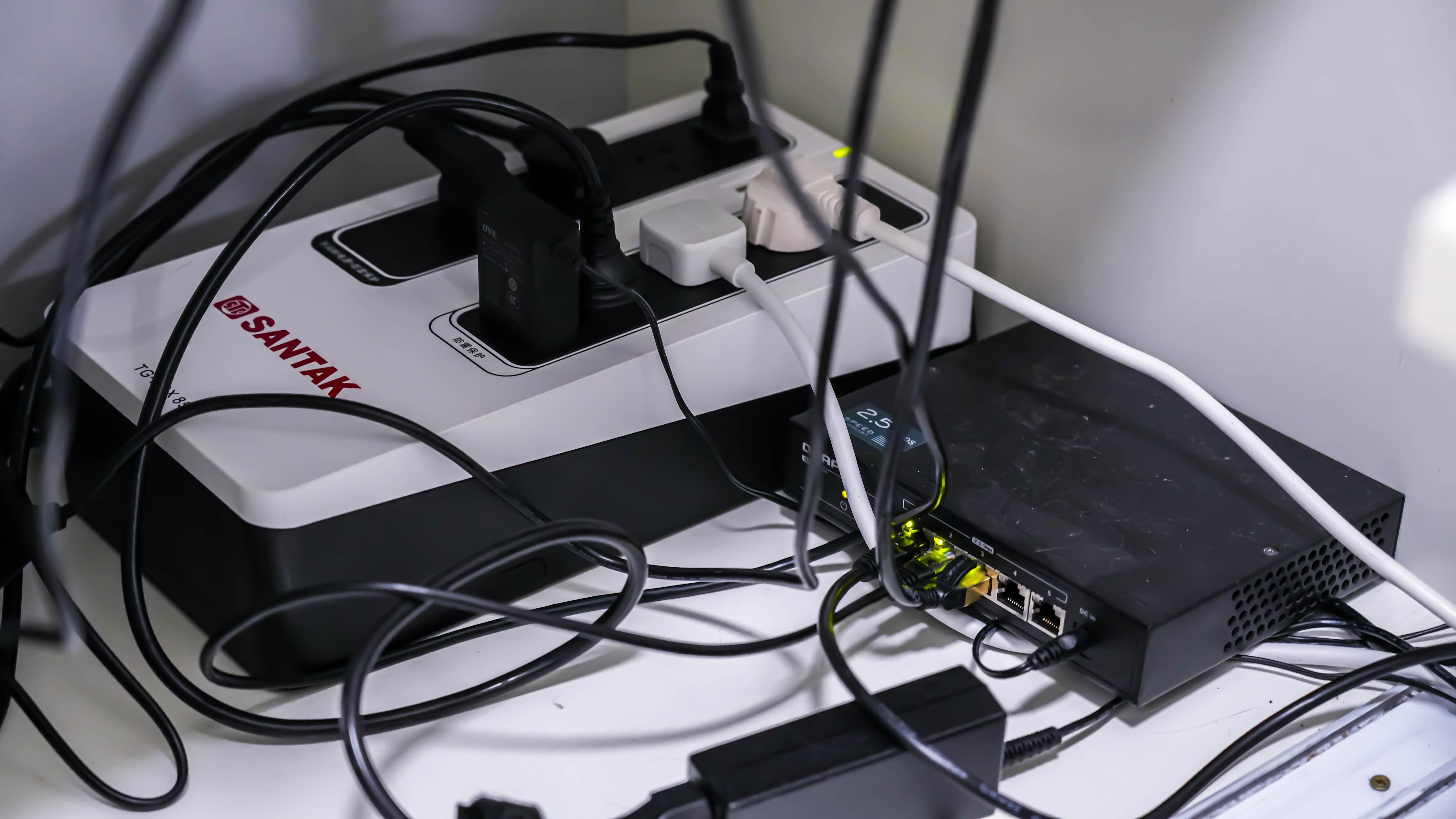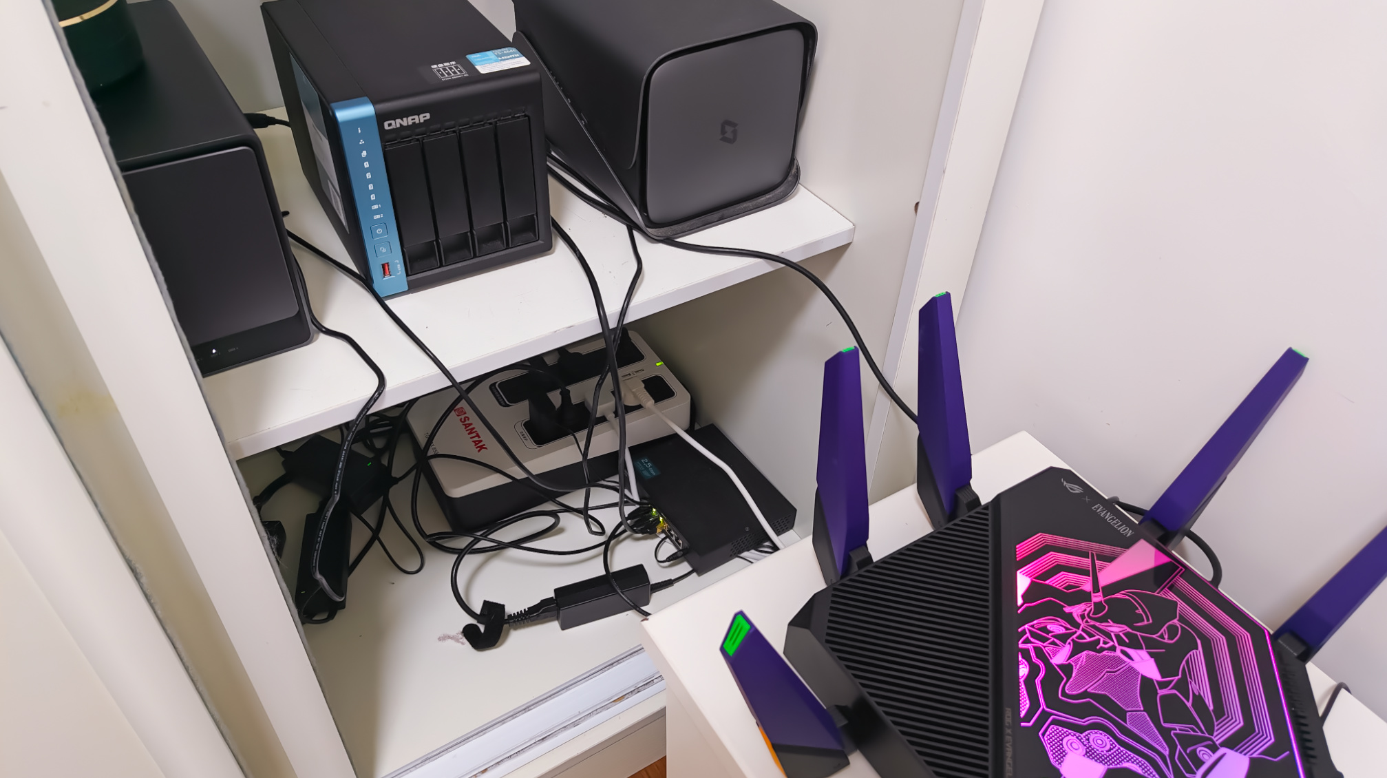 我的配件是用的是山特TG BOX 850的UPS、路由器是华硕ROG GT-AX11000 Pro新世纪福音战士款,还有2个在客厅是华硕的灵耀AX魔方Pro,组成MESH网络使用,交换机是威联通QSW-1105-5T 全2.5G傻瓜式交换机。