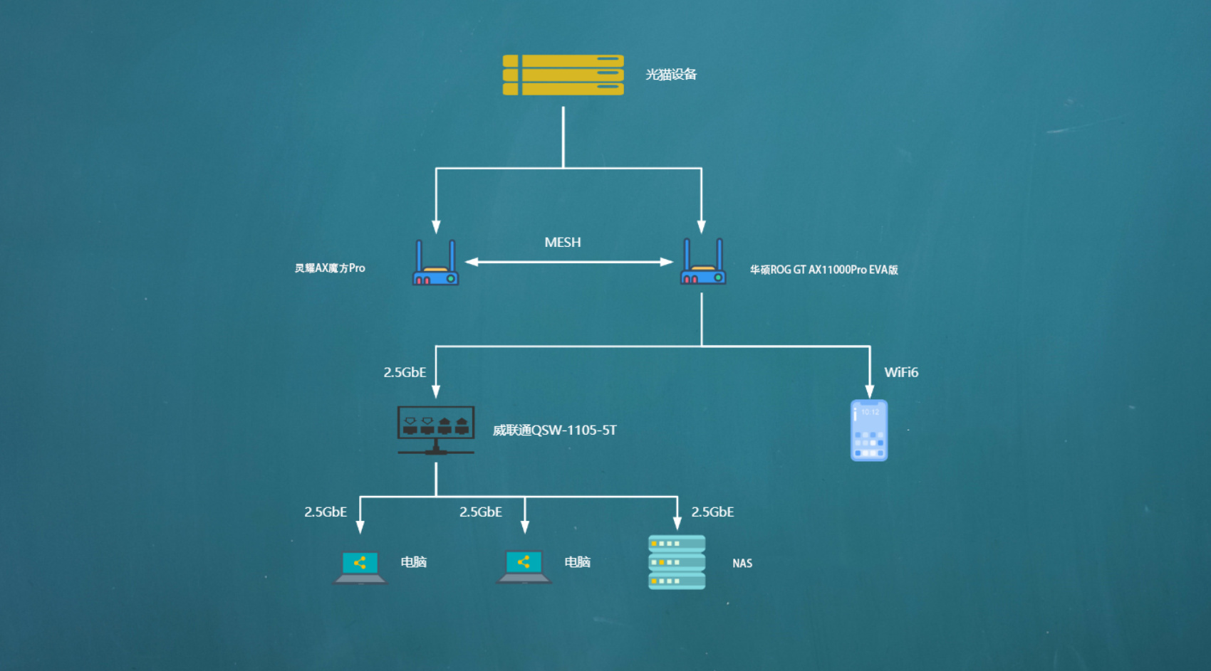 目前我家中的布局图如上,首先路由器需要有2.5G网口,我采用的是华硕灵耀AX魔方pro作为主节点,华硕ROG GT-AX11000pro作为副节点,两个路由器之间通过无线MESH组网。