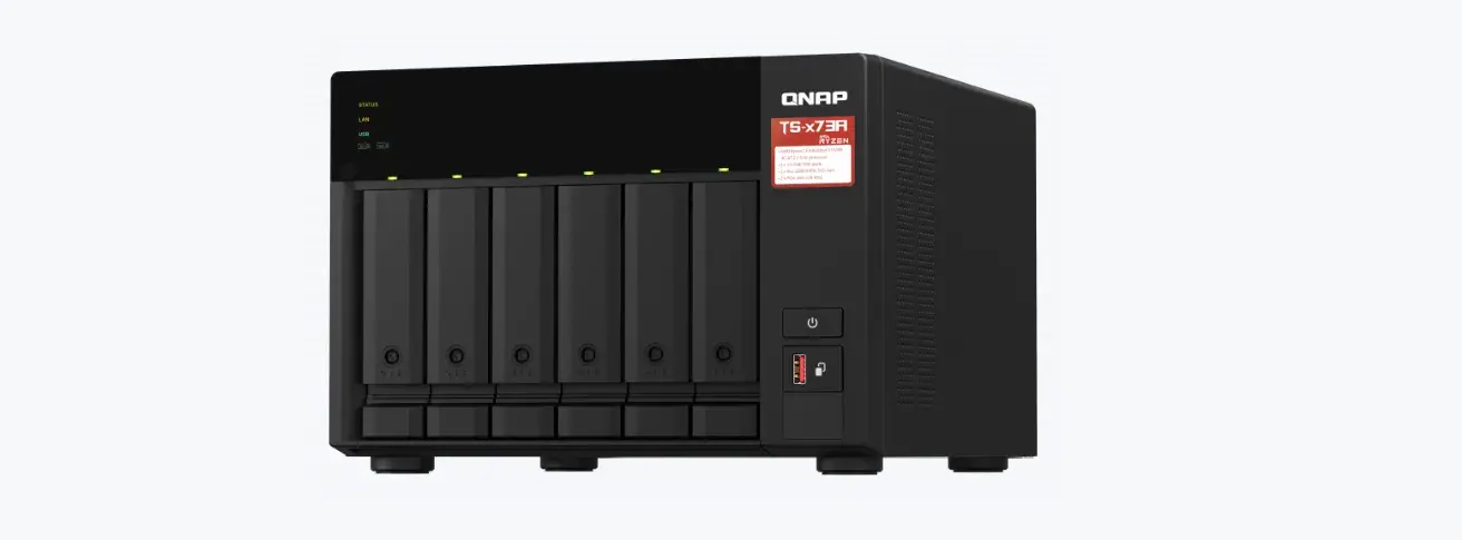 威联通TS-673A是高性能偏向商用也可家用的NAS,采用AMD Ryzen V1500B四核心处理器,性能是以上推荐NAS里面最强的,本身没有集显,如果不插显卡视频转码效率较低,装了显卡性能爆表。它还提供了2个PCIe3.0插槽,2个M.2 NVMe SSD插槽,HDMI2.0接口,2个2.5GbE网口,无论是4K高码率视频创作、万兆文件传输、win11虚拟机、软路由、Docker、HTPC家庭影院都能轻松驾驭,可以说是一步到位的机型。