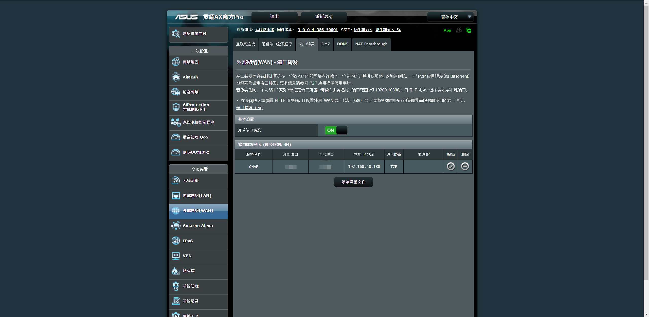 接下来,你也需要在路由器后台进行端口转发设置。端口号还是同一个,内外保持不变,局域网主机IP地址设为 NAS 地址即可。