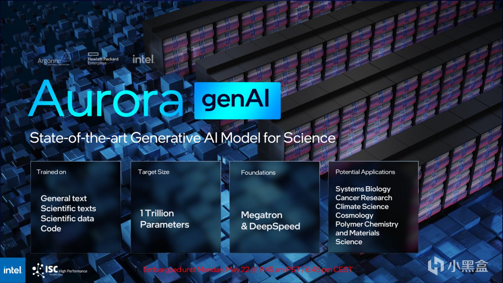 Aurora超算用于在各种工作负载上执行生成式AI工作,包括以科学为导向的AuroraGPT大型语言模型,1万亿个参数,基于Megatron和DeepSpeed技术这些生成式AI模型用于训练生物学、化学、材料科学、物理学、医学和一般文本、代码以及结构化科学数据这些模型可用于各种科学应用,从分子和材料设计到数百万个来源的知识综合,以提供系统生物学、高分子化学和能源材料、气候科学和宇宙学等方面的新实验和建议这些模型还用于加速识别与癌症和疾病相关的生物过程,为药物设计提供目标