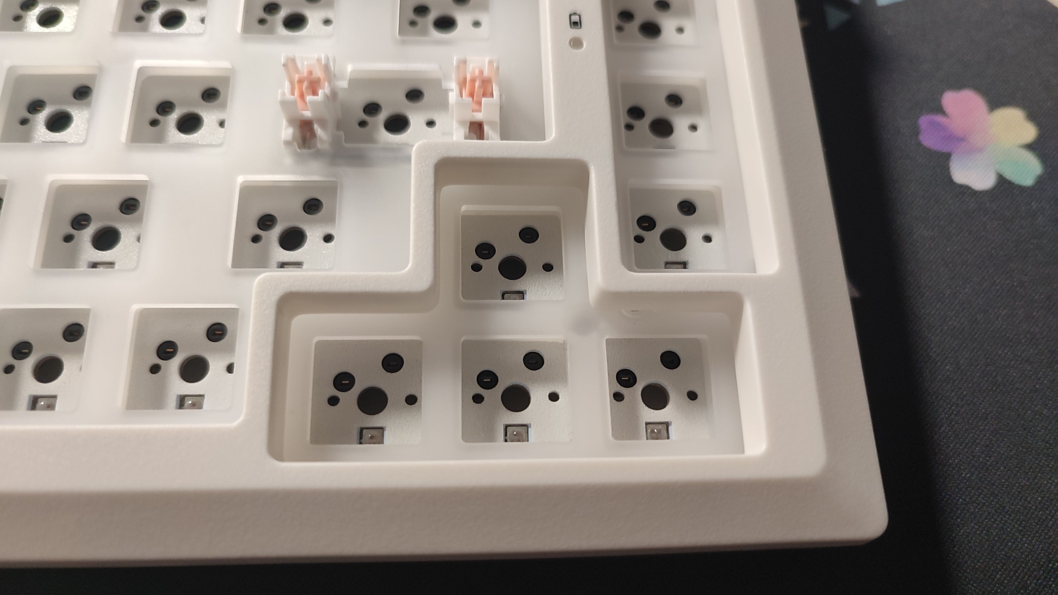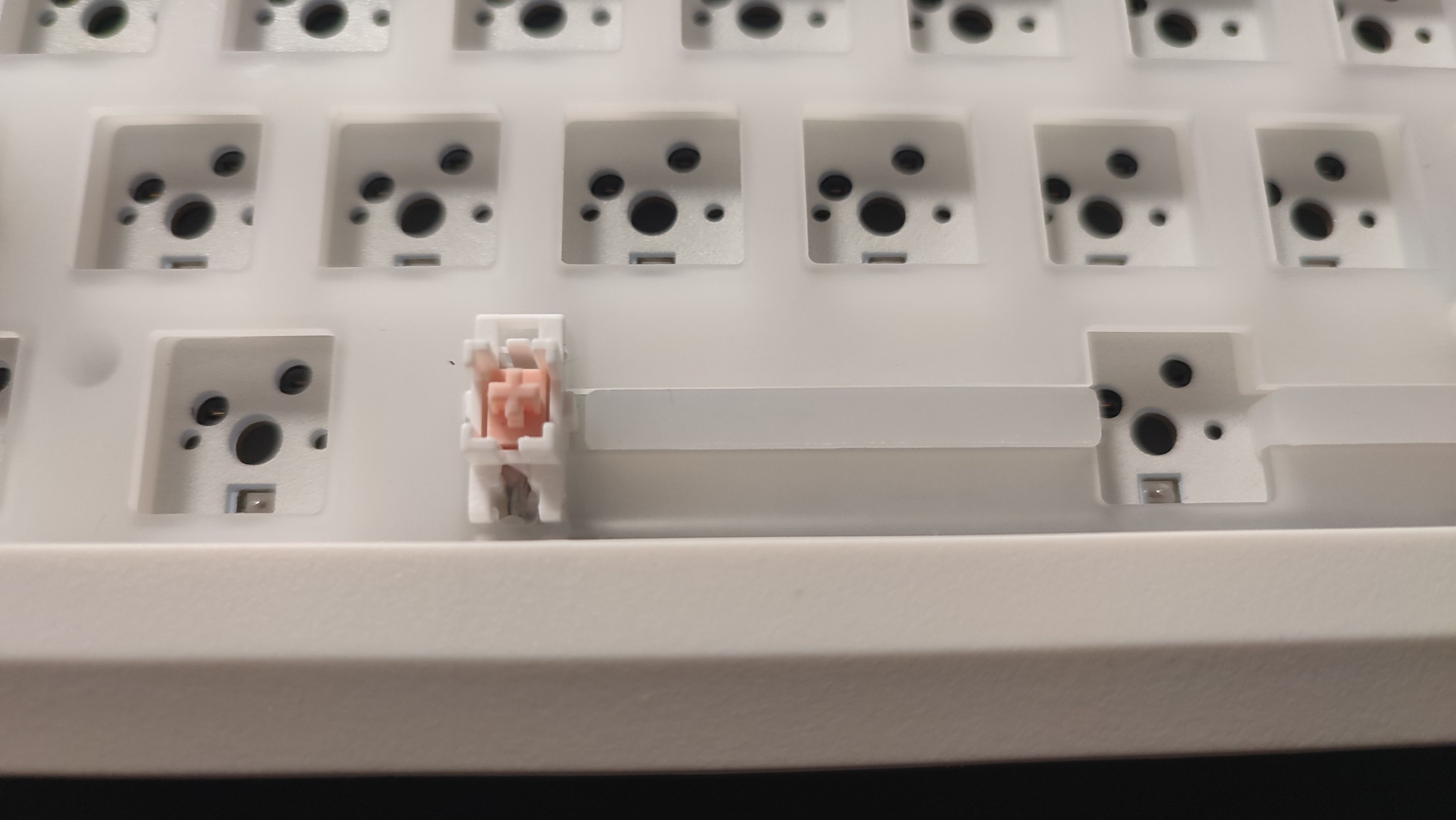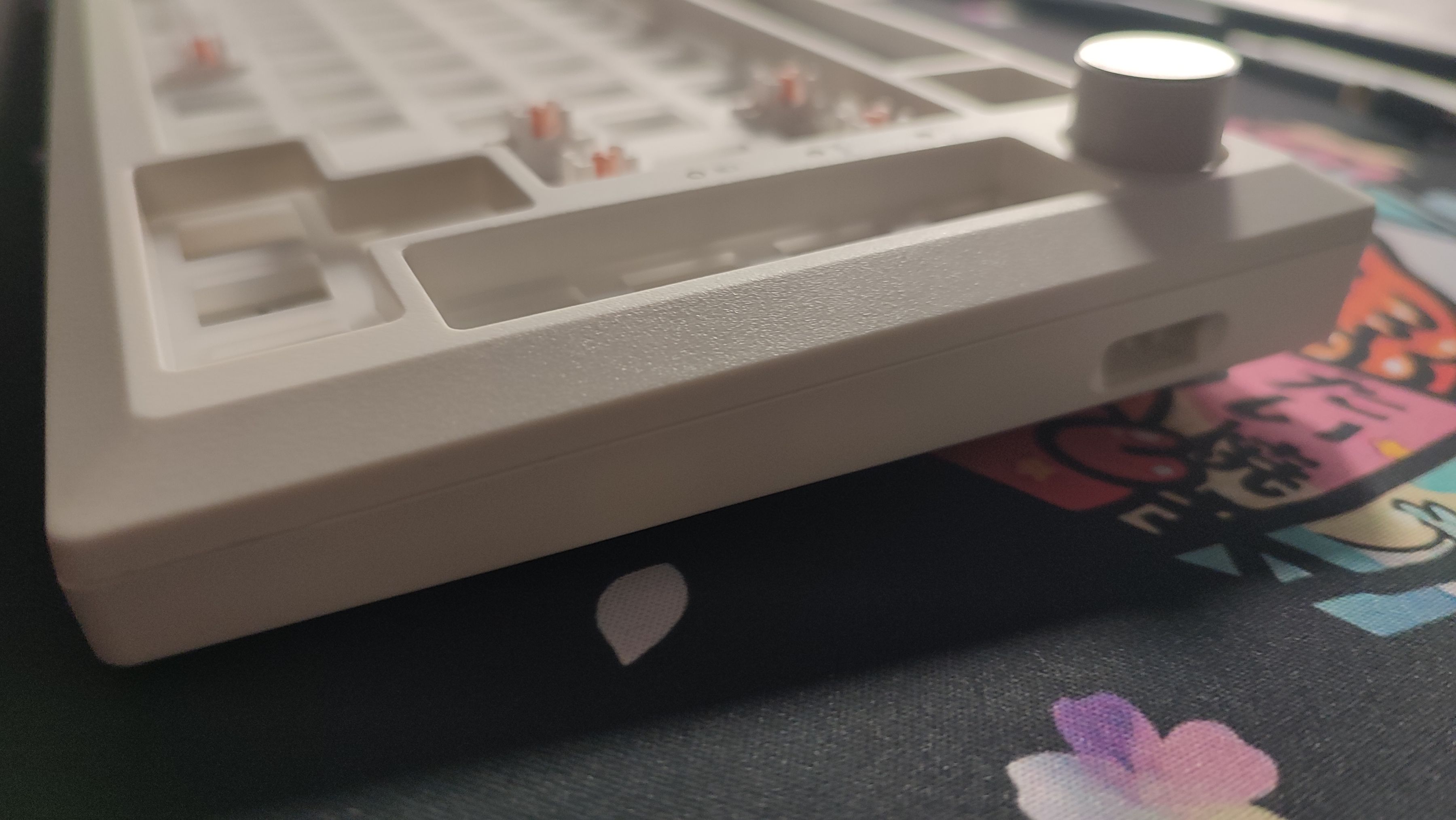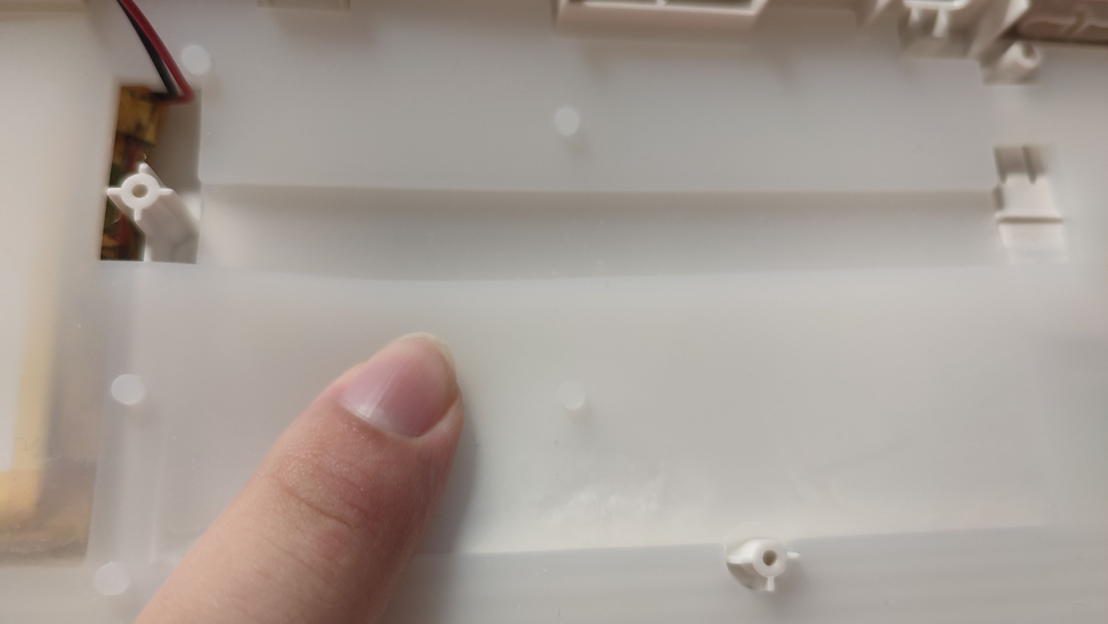底壳上可以看到增加了许多的限位柱,对于一把GASKET键盘来说这么多的限位柱会限制住软硬程度,也就是不会特别“软弹”,而同样这一把键盘虽然是GASKET结构,但并不是很软。