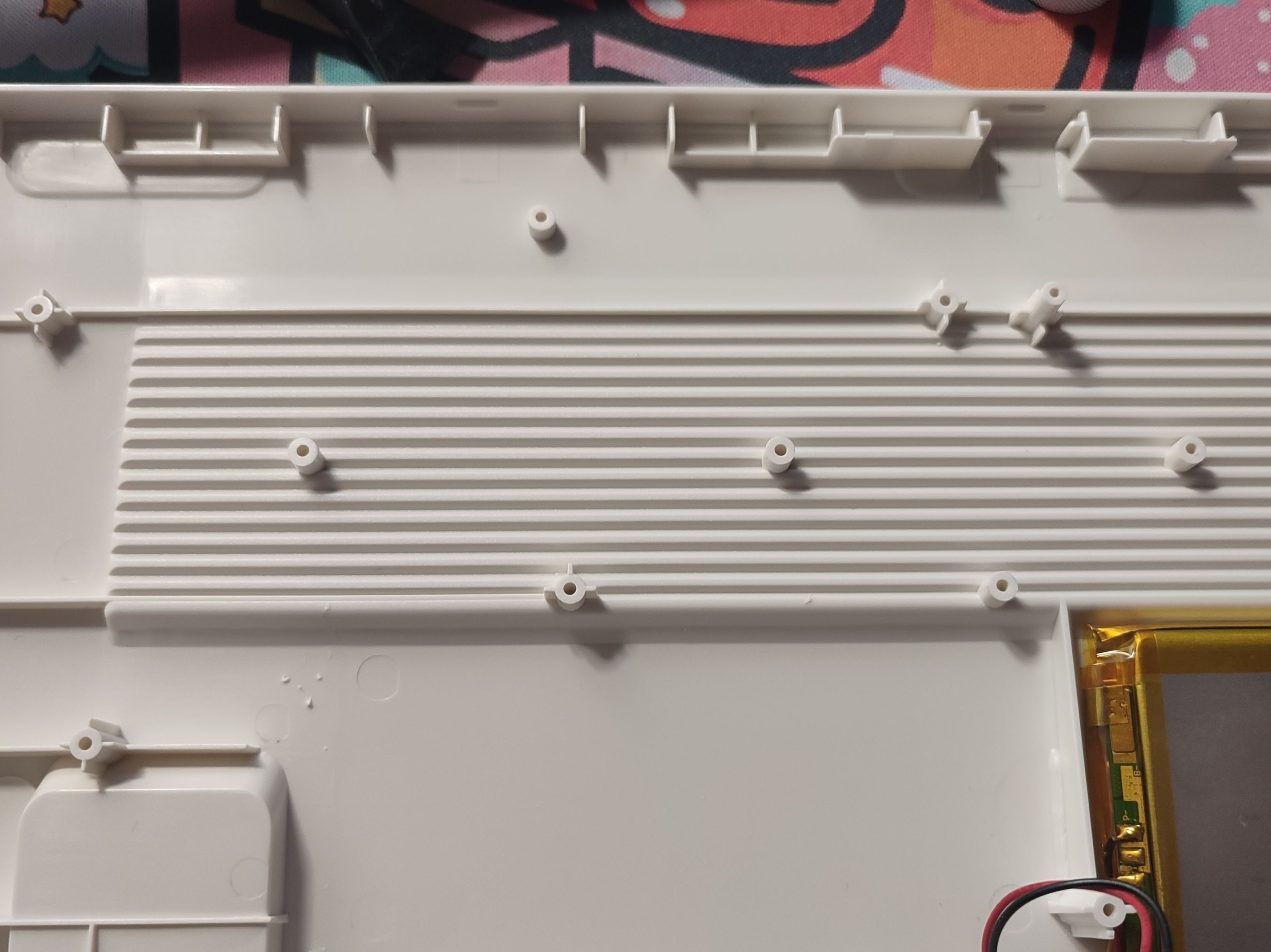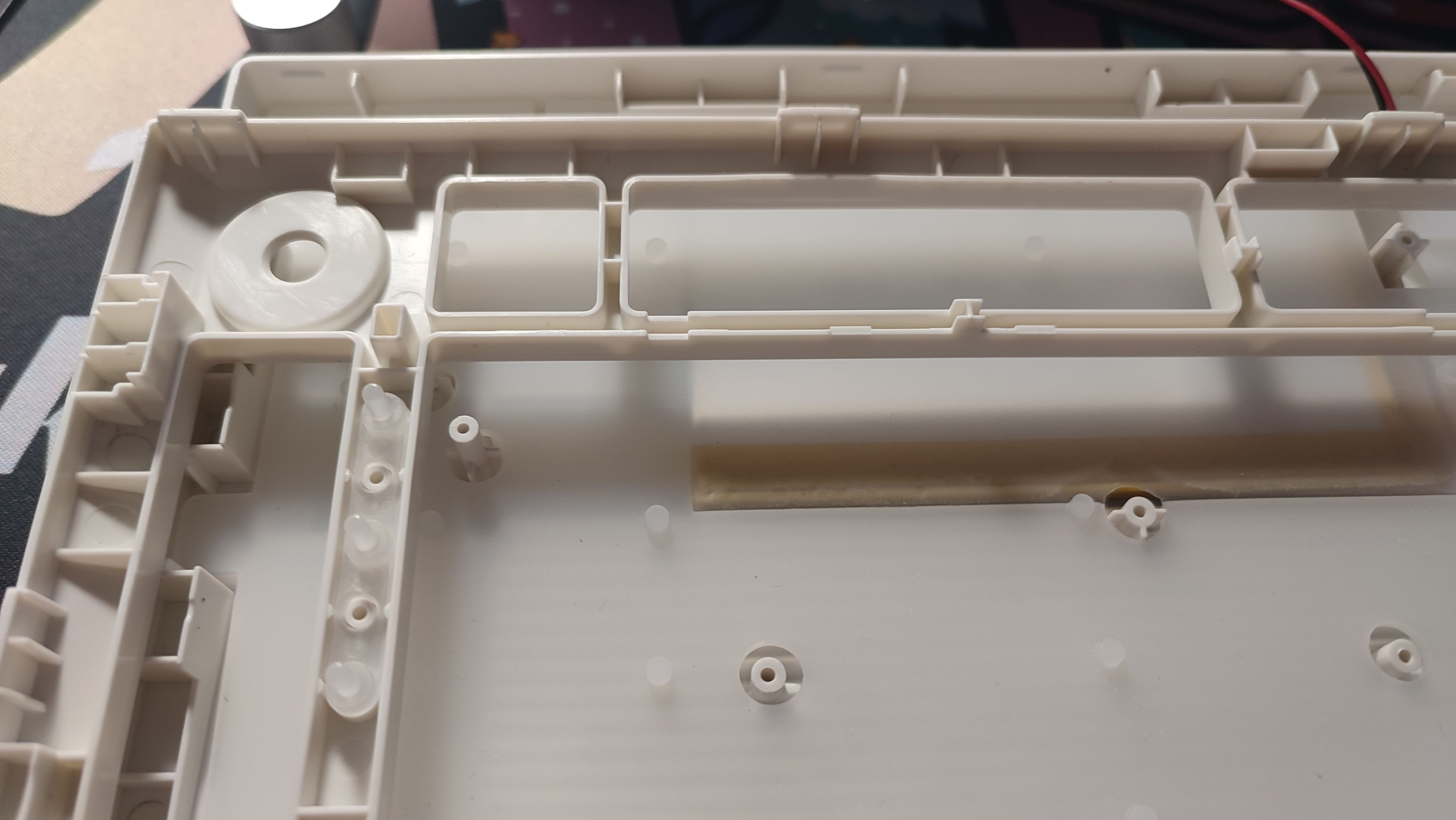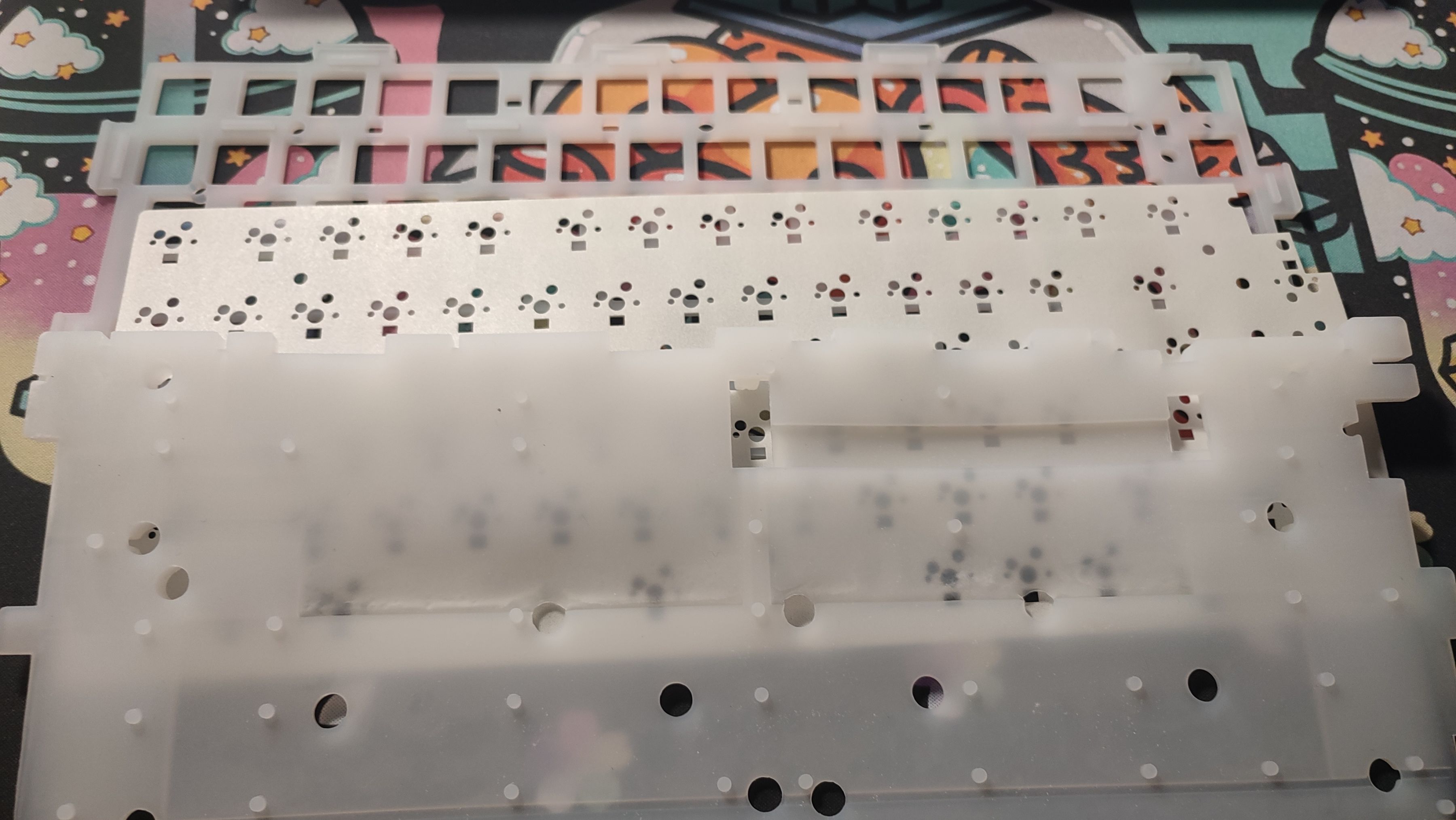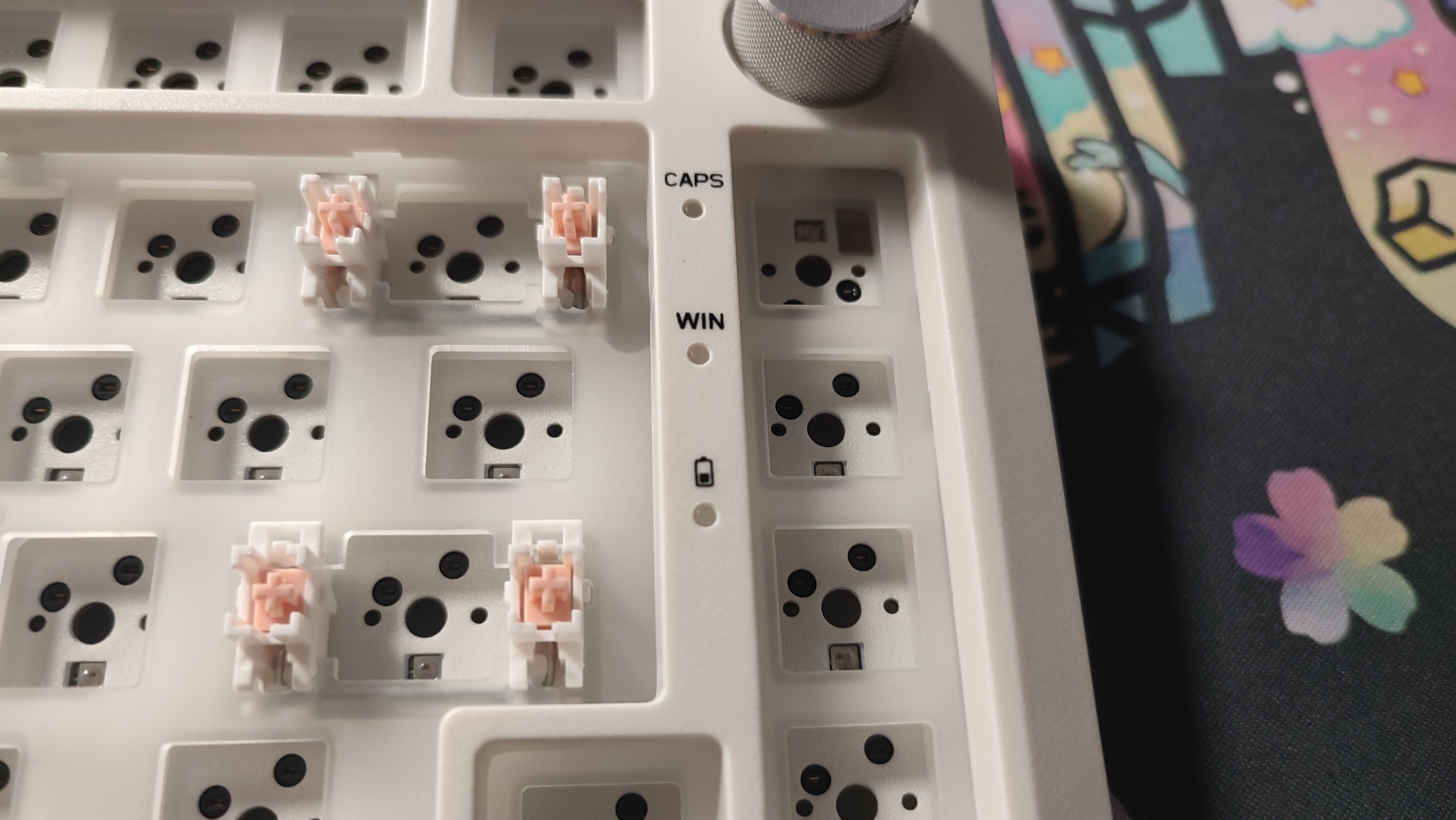 底壳上可以看到增加了许多的限位柱,对于一把GASKET键盘来说这么多的限位柱会限制住软硬程度,也就是不会特别“软弹”,而同样这一把键盘虽然是GASKET结构,但并不是很软。