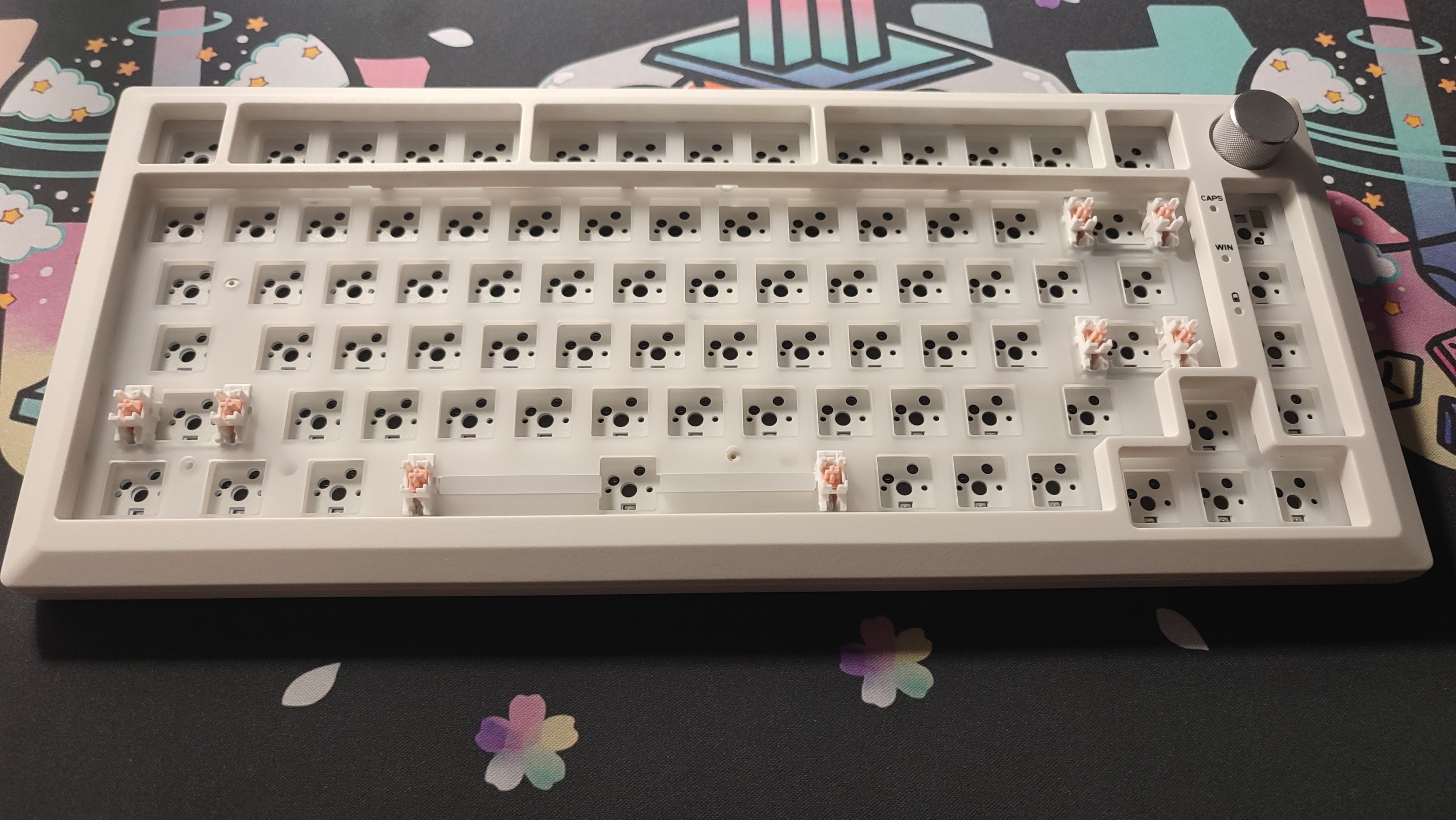 DK75采用的是钢板卫星轴,这套卫星轴没认错的话应该是DKV3那一套,这套卫星轴的素质还是十分不错的,可以参考我测评的视频:我是传送门。同时空格处的空腔也有硅胶填充,可以有效消除敲击空格时产生的空腔音。
