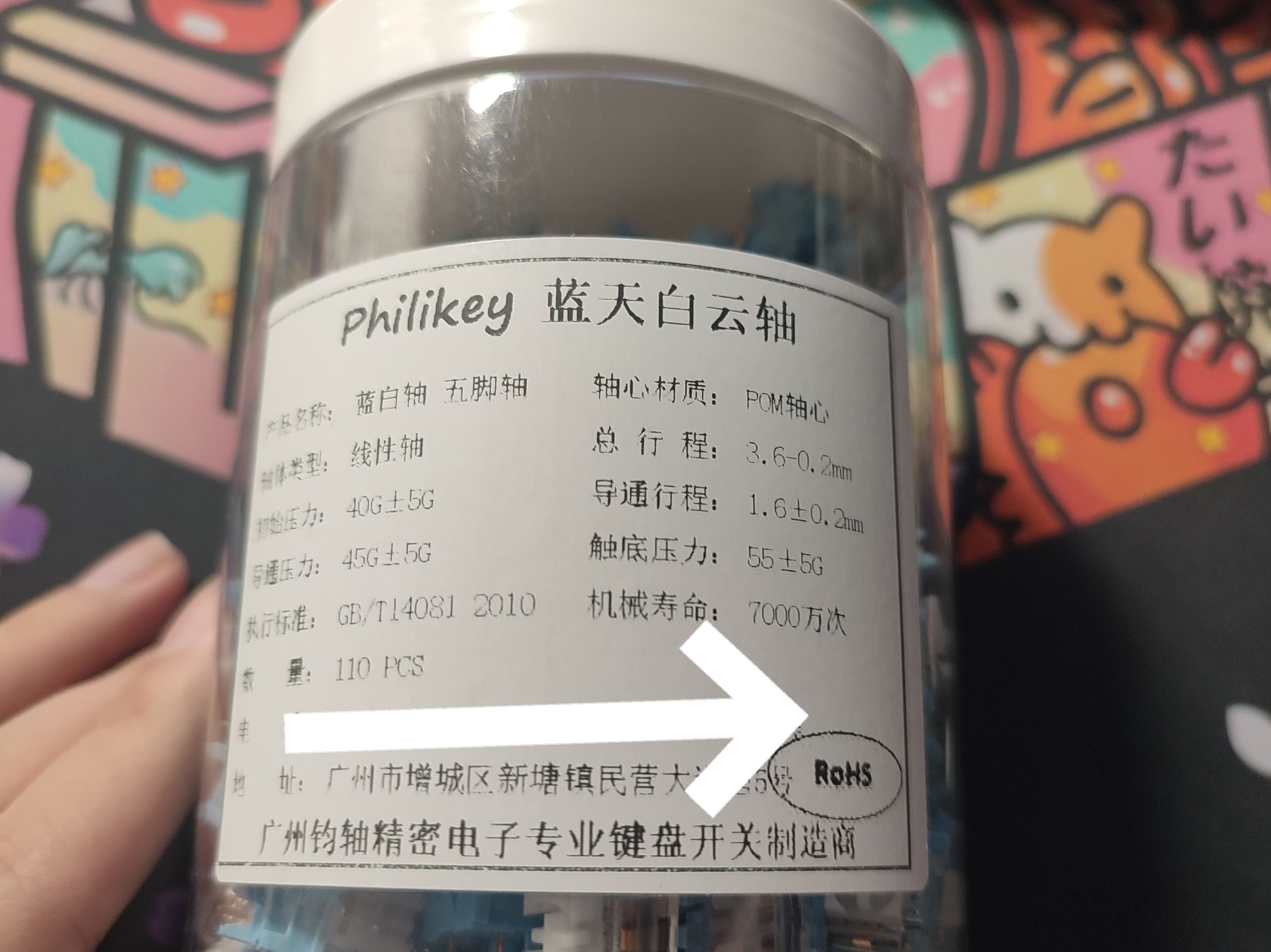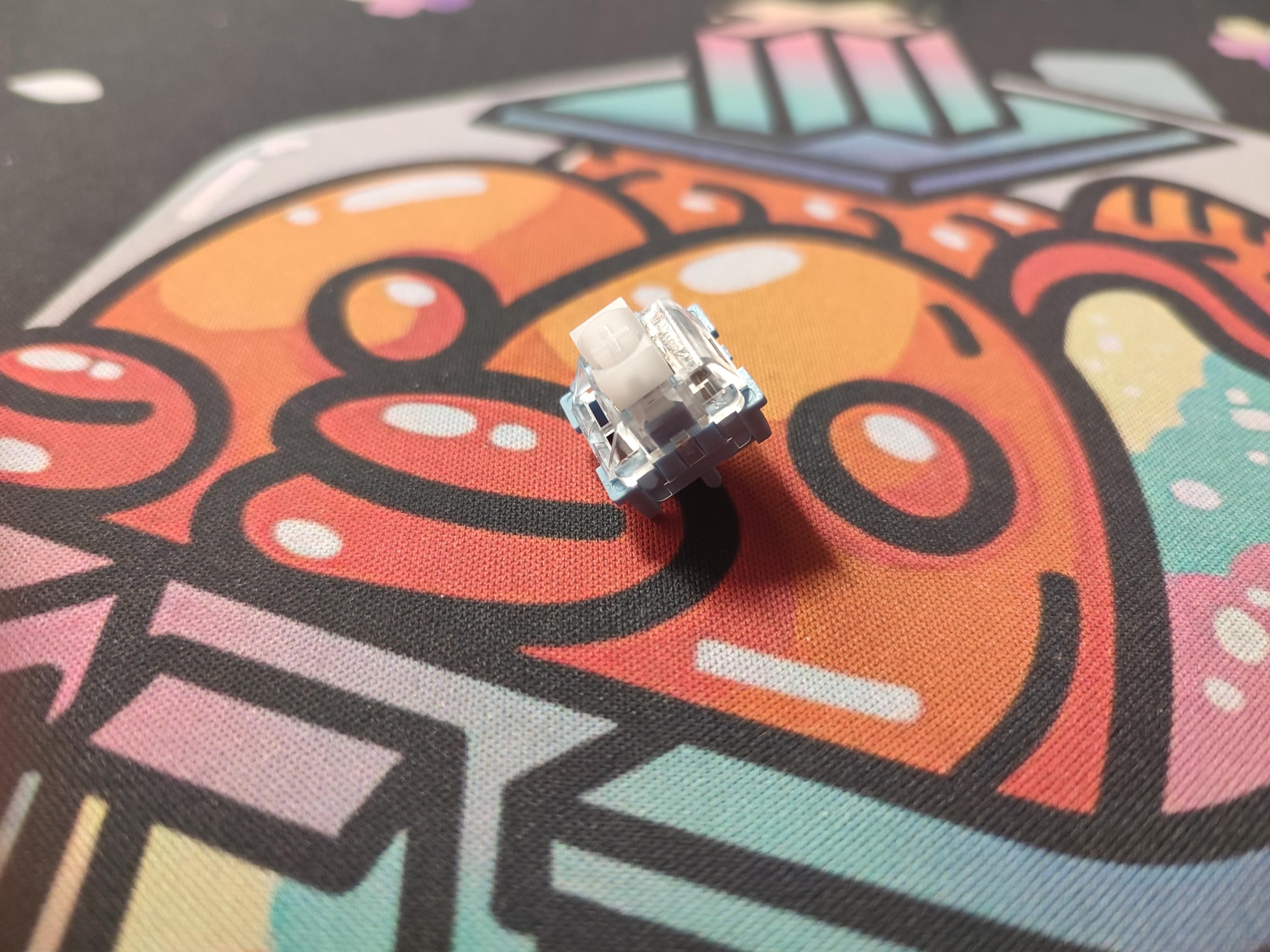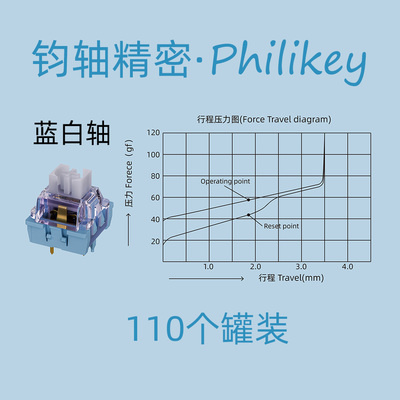 轴体选用了新发布的蓝天白云轴(开箱玩家狂喜),价格十分亲民,仅有0.68。而在这个价格,做到了POM轴芯,透明上盖,以及提前触发。同时也是五脚轴,上机过后更稳定。