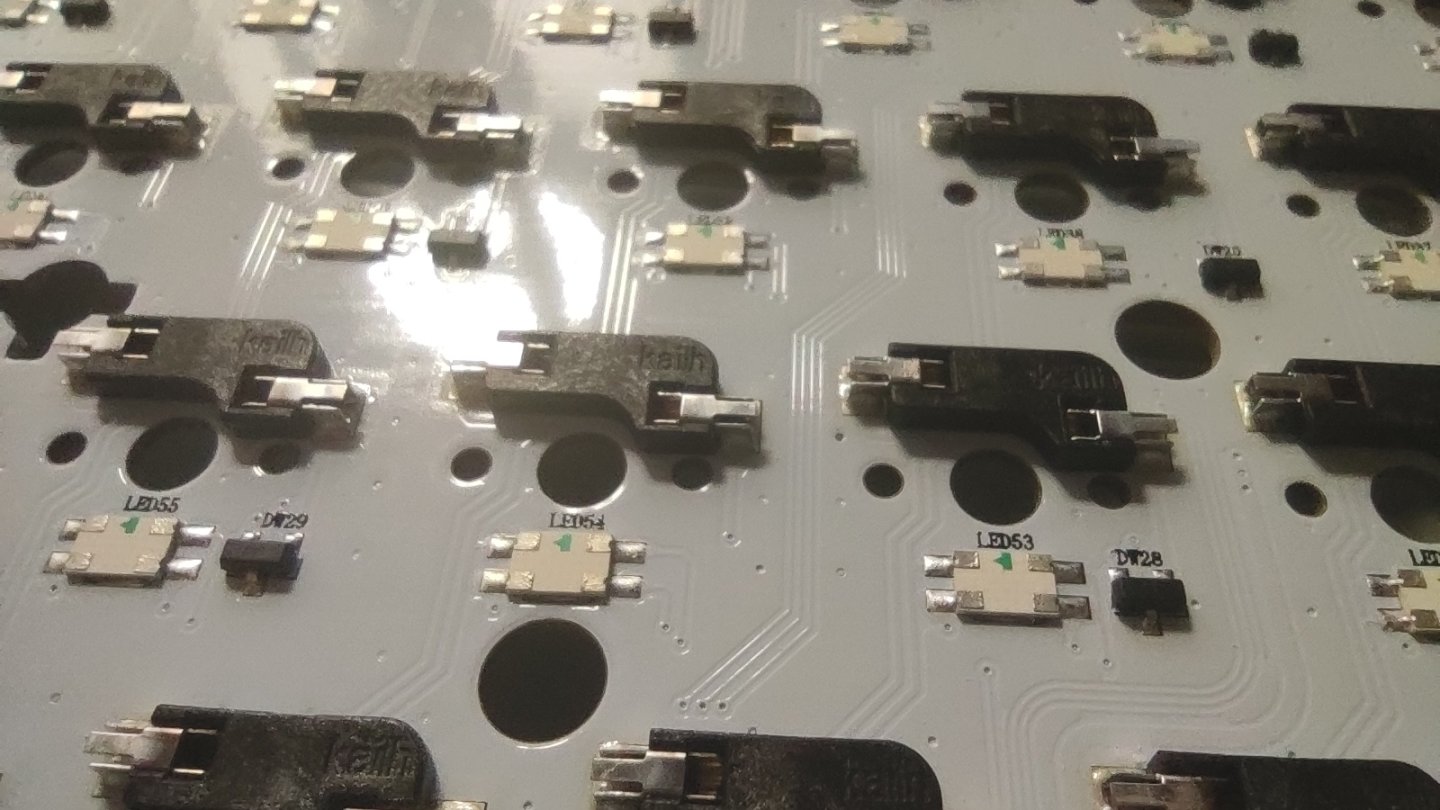 从PCB可以看到采用的是凯华轴座,可以兼容市面上绝大多数的三脚五脚机械轴体,同时可以看到DK75由单模版本的上灯位改成了下灯位。对于使用侧刻透光键帽的玩家来说亮度会高一点。