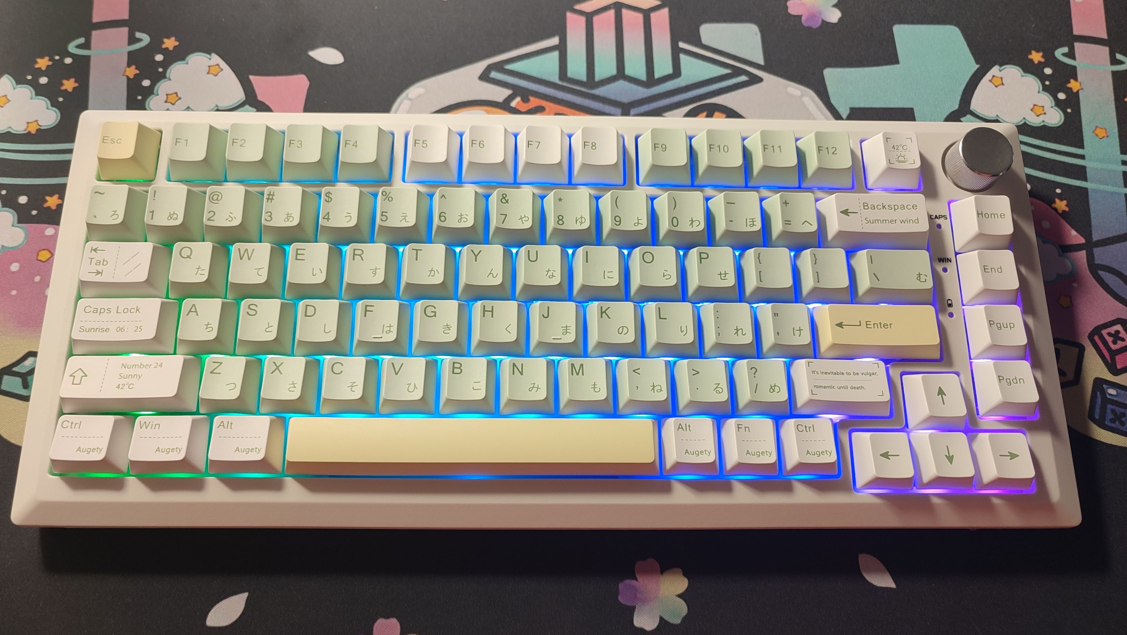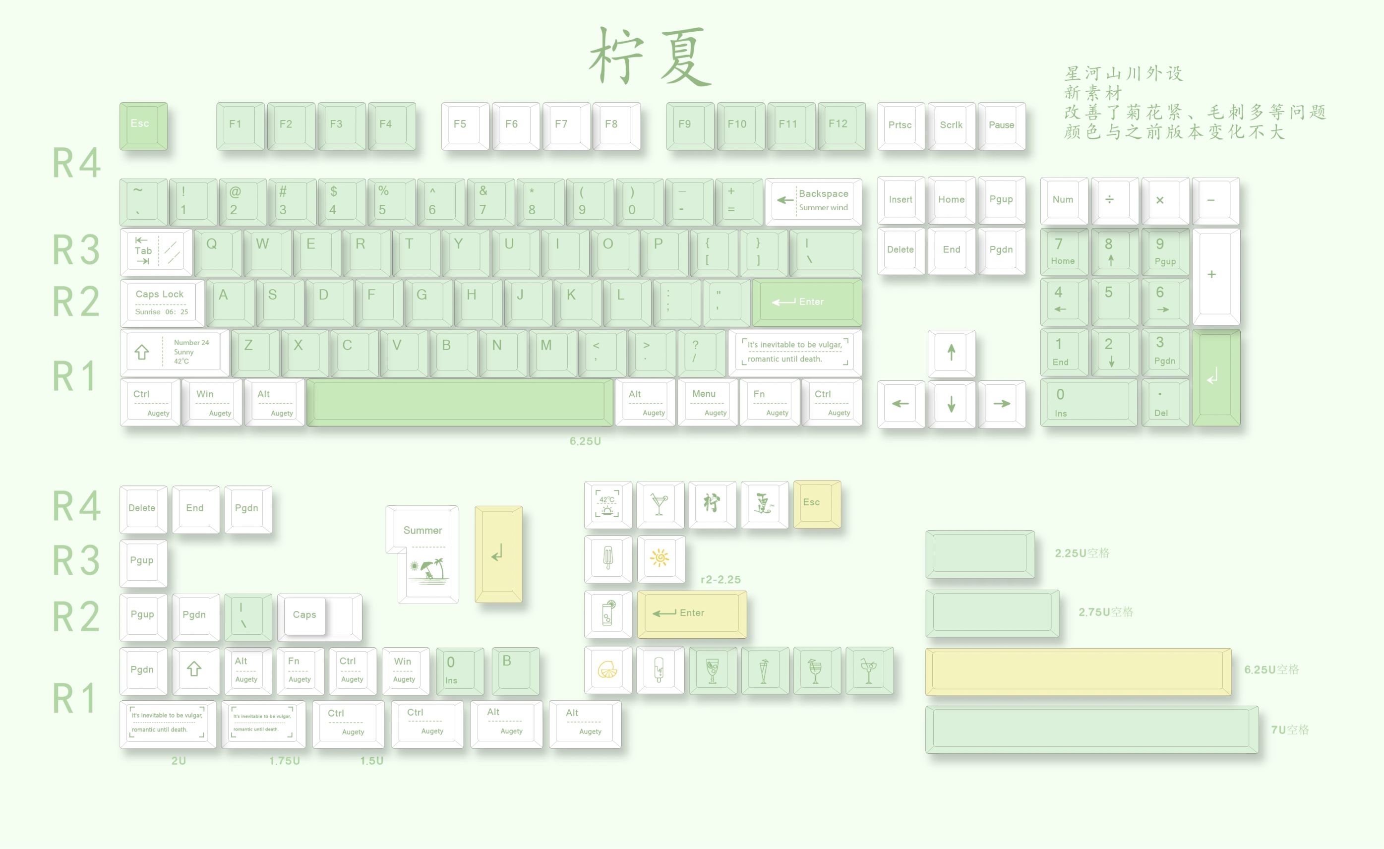 键帽选用了星河山川家的天气V8 3.0(柠夏),材质为PBT,原厂高度,147键,整体配色十分小清新,主键区用的浅绿色为底色,字符颜色为深绿色。这套键帽采用的是热升华的工艺,所以字符样式以及图案丰富性会比较好。因为买的较晚只有日文字根了,所以不得已只能使用这套日文字根的。