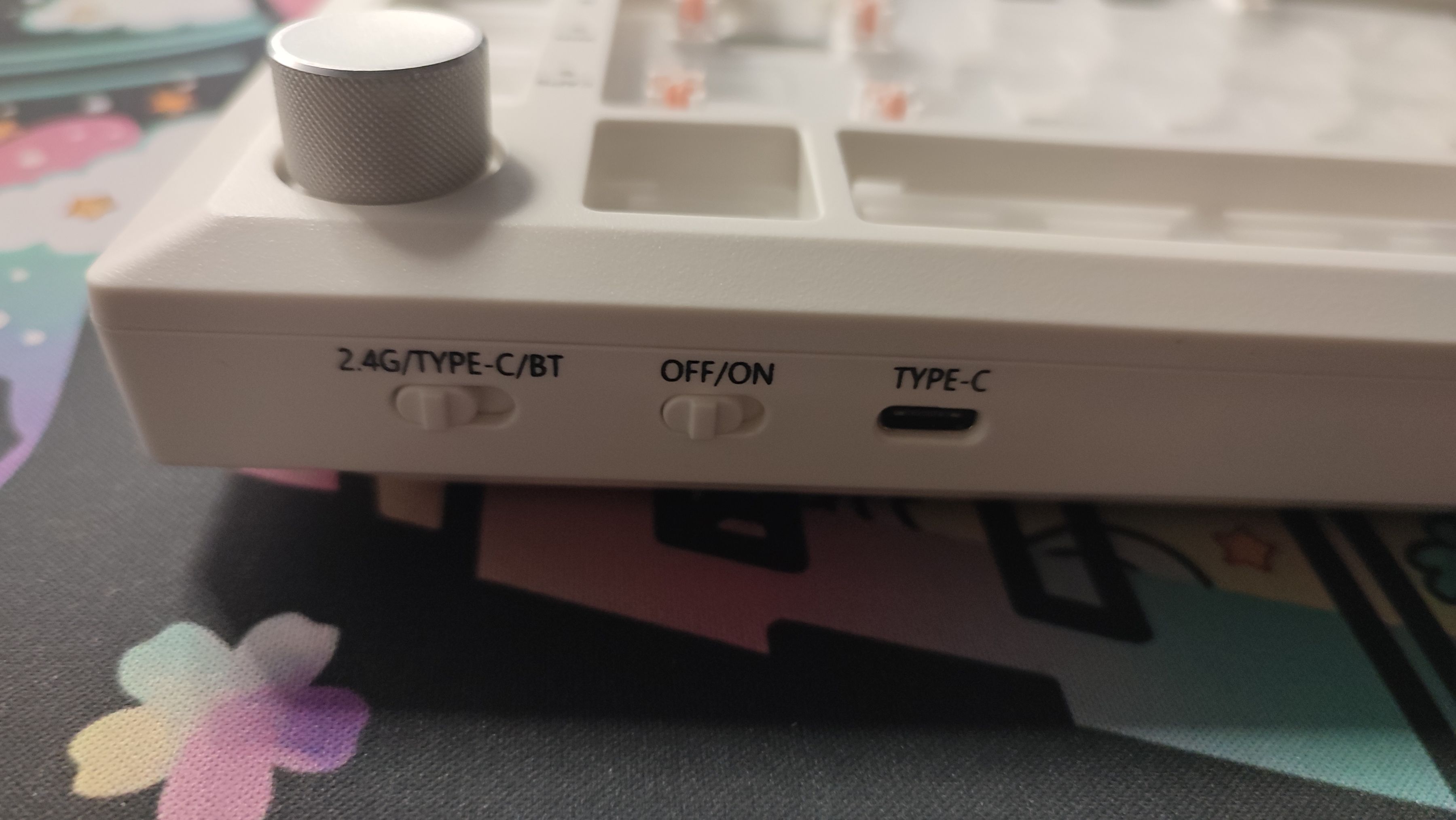 Type-c接口以及模式切换按钮都在键盘顶部,除了常见的三模切换开关之外还有一个电源开关。个人觉得有点鸡肋,因为平时我不用了都是直接拨到有线也是一样的作用。
