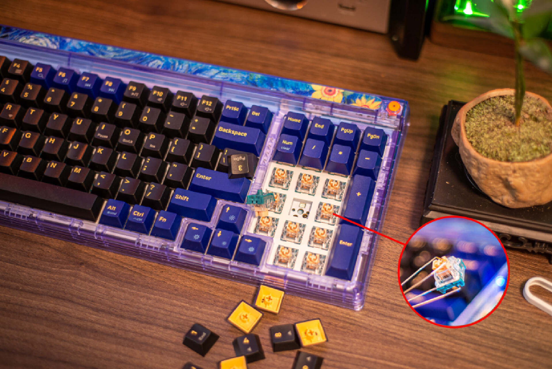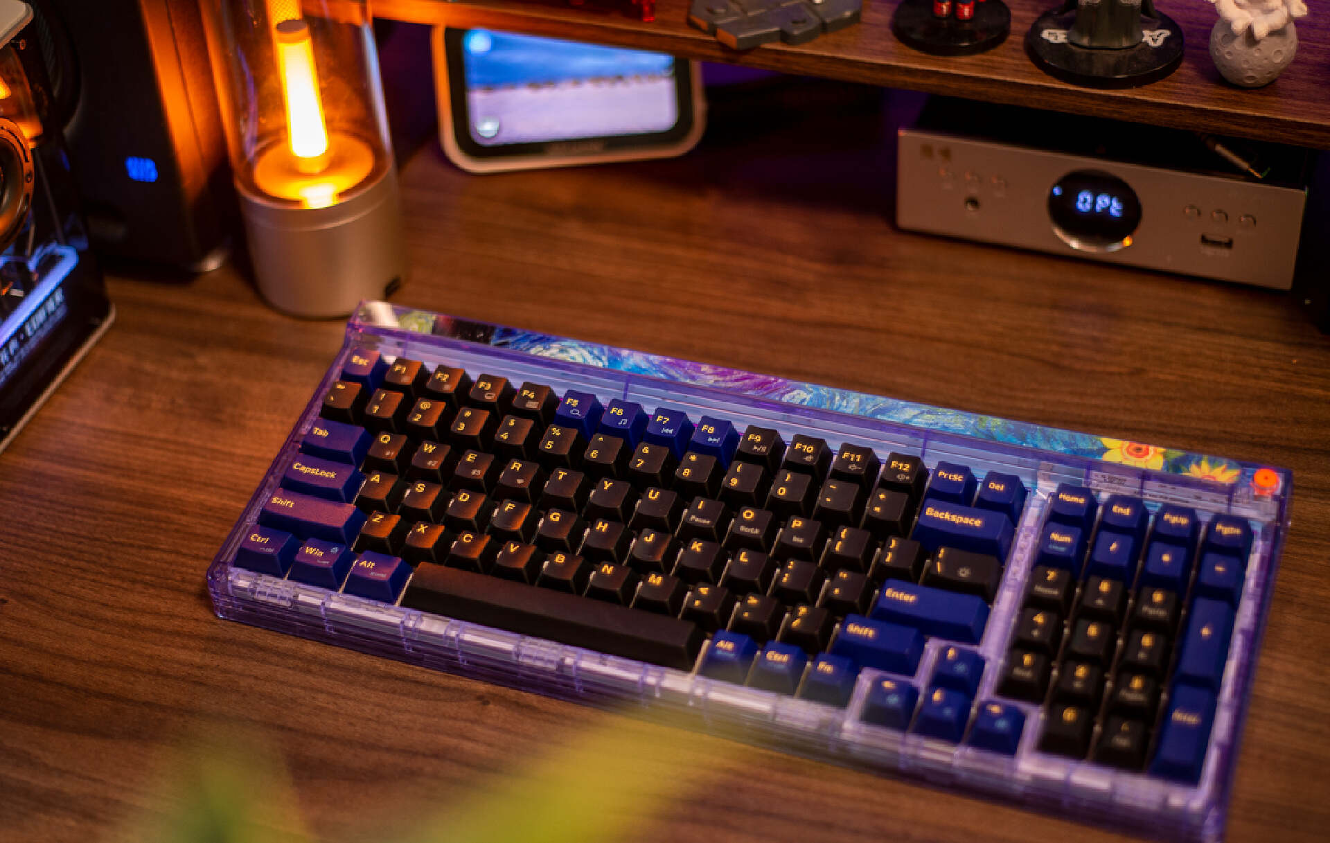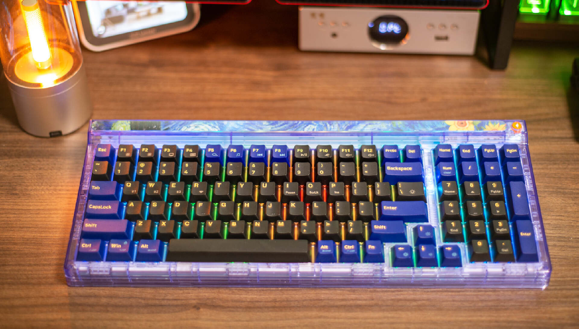 ▼其次就是颜值高。键盘主体以蓝紫配色凸显神秘,黑色键帽模拟虚空深邃感,辅以梵高传世画作《星空》的装饰性元素,使其配色极有辨识度。此外,键盘采用了少见的透明外壳,连底壳都是透明的,可以清晰看到内部结构,不仅透光度高还工艺美感满溢。