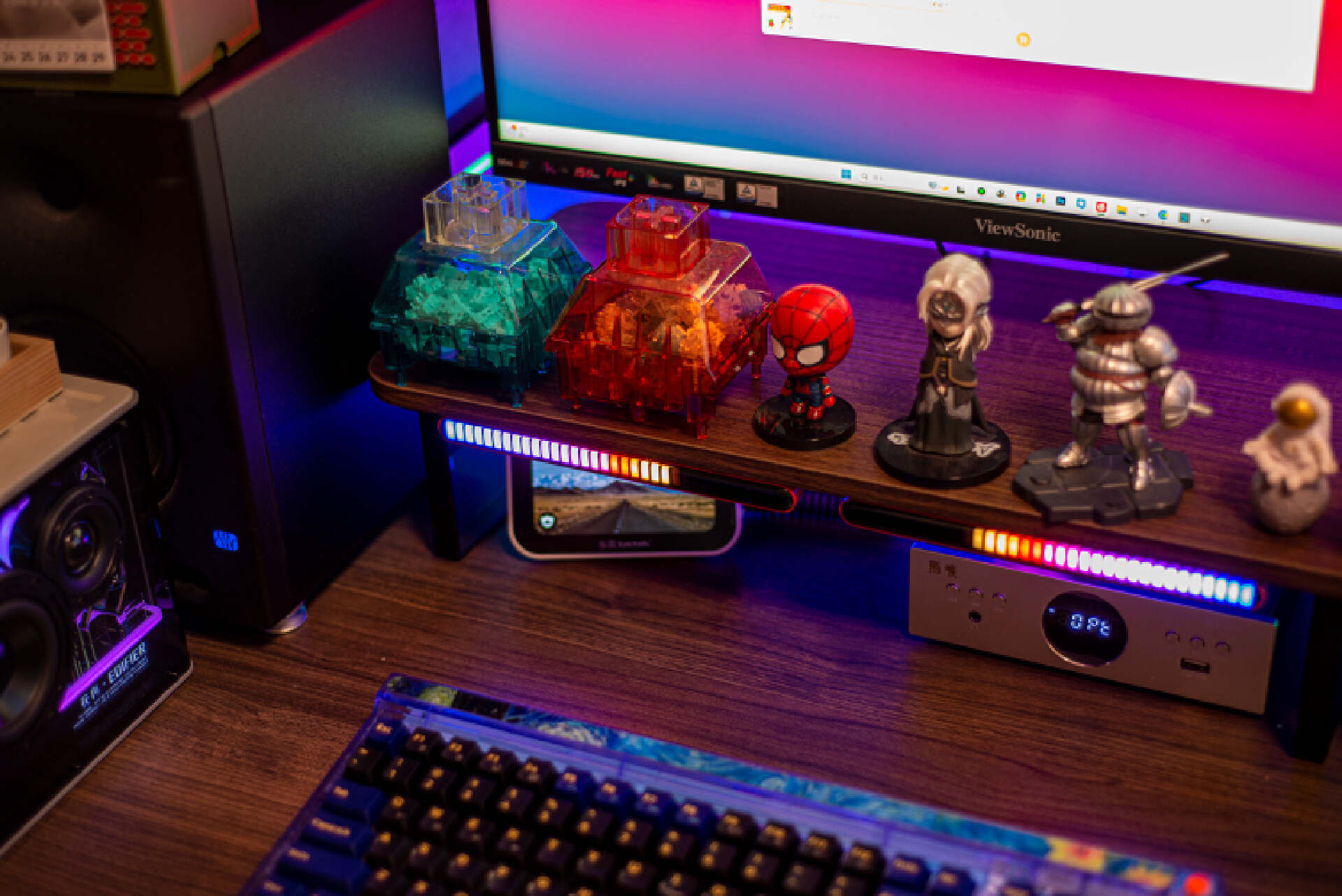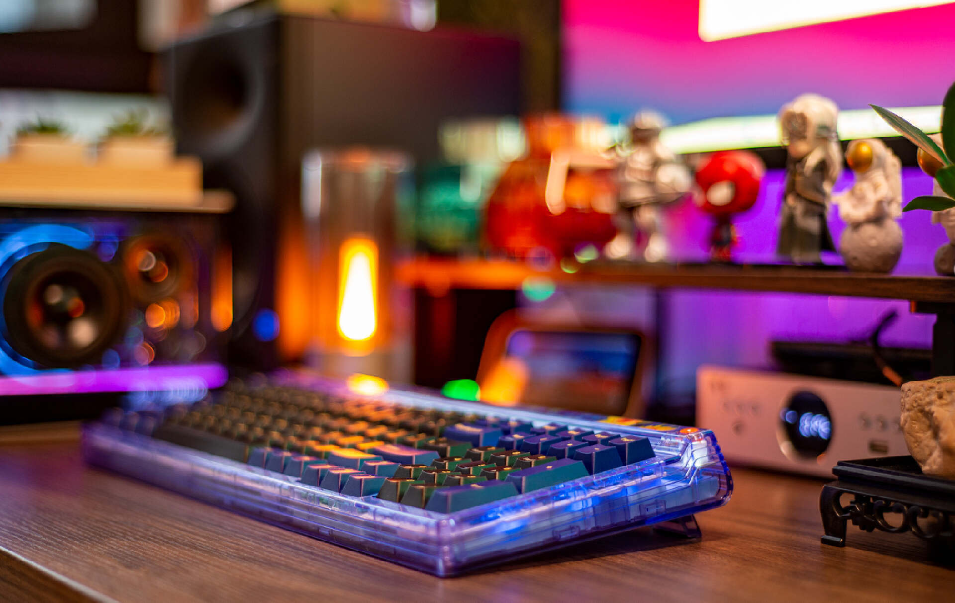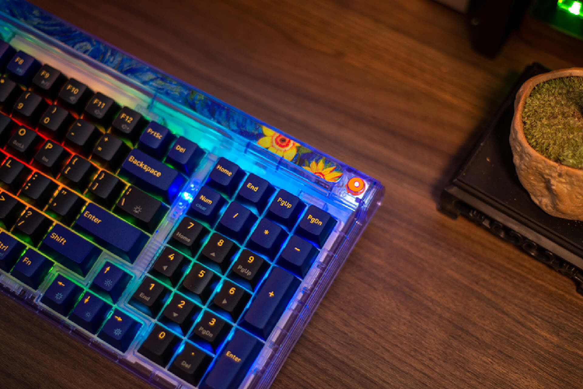 ▼其次就是颜值高。键盘主体以蓝紫配色凸显神秘,黑色键帽模拟虚空深邃感,辅以梵高传世画作《星空》的装饰性元素,使其配色极有辨识度。此外,键盘采用了少见的透明外壳,连底壳都是透明的,可以清晰看到内部结构,不仅透光度高还工艺美感满溢。