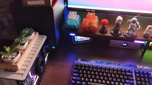 ▼重点是灵敏度真的很高,稍微有点声音就能激发灯光效果。别说放音乐看电影了,就是单纯键盘打字都能准确识别响应,对我这种键盘控来说更显实用。我把它固定在置物架下方简直完美。多说无益,动图奉上。