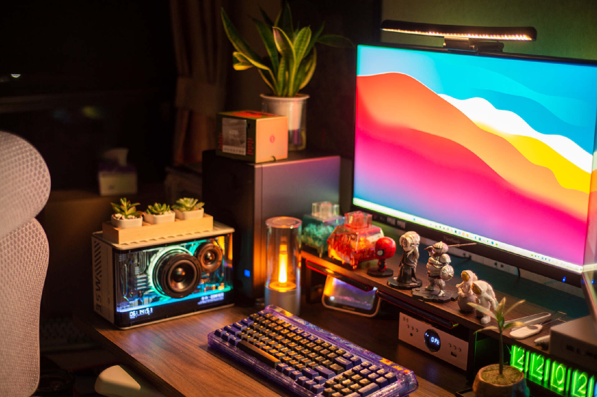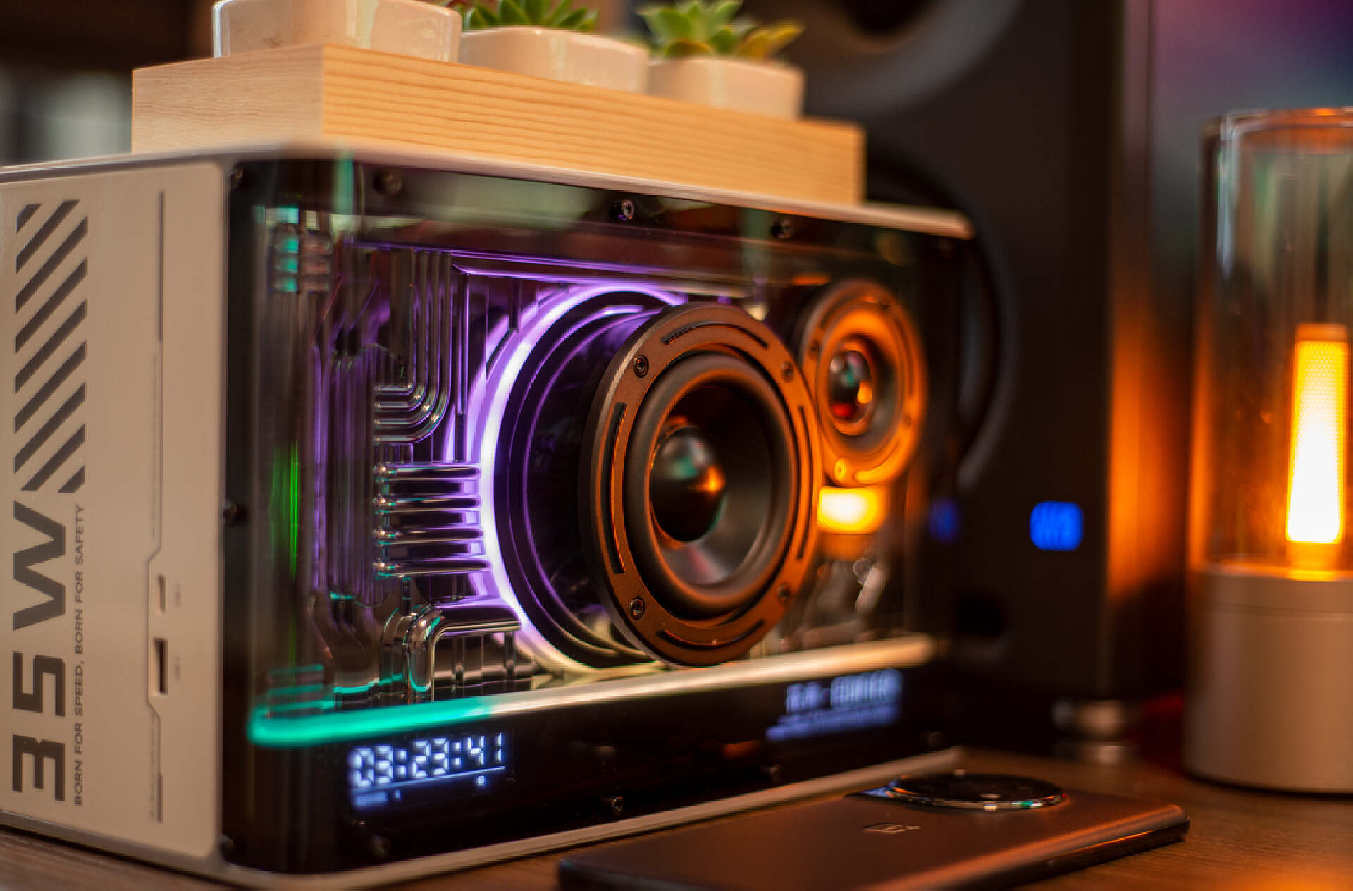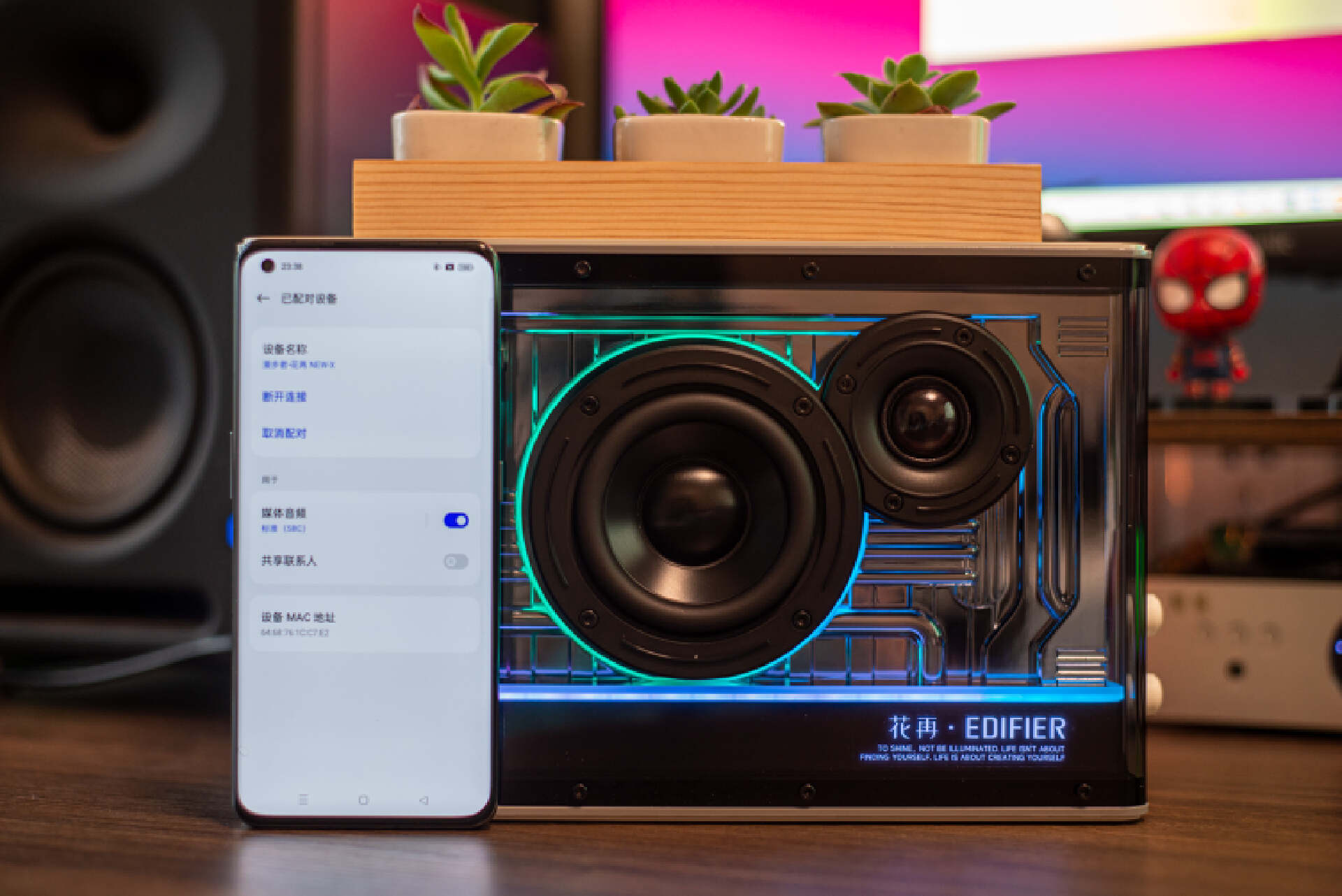 ▼音箱最大的特色估计就是这套灯光系统,点亮后表面水管纹路光影流转,很有种赛博的味道;音箱支持高达1680万种光效显示,可以利用手机选择不同色调搭建不同的场景,听音乐时还有律动灯效营造氛围感。这美美的视觉享受,称之为桌搭神器毫不为过。