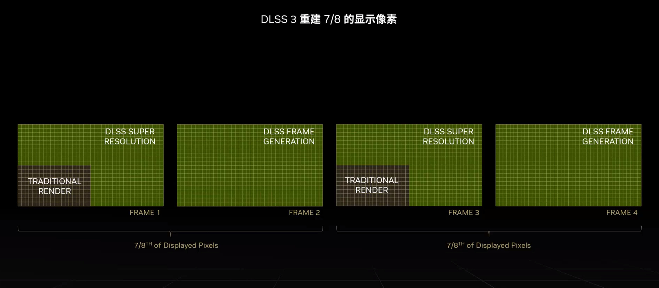 ▲同时,DLSS 3 潜在帧生成技术与超分辨率技术结合,渲染1080P分辨率的原始画面,再超分辨率到4K画面,同时,2个4K分辨率的帧之间再生成一帧。所以,平均两个4K帧中,只有一张1080P的帧是CPU与显卡实际渲染的,占总生成画面的八分之一,可见DLSS技术对帧数提升之大。
