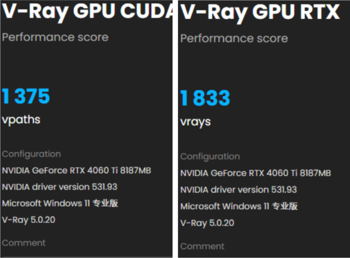 本次测试中我们只使用V-Ray GPU CUDA测试中的GPU模式与V-Ray GPU RTX测试两项。