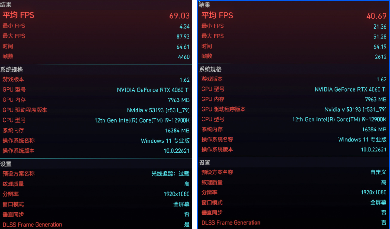 在1080P分辨率、光线追踪超级画质下,DLSS 3相较DLSS 2的帧率提升为49.3%;而在光线追踪过载画质下,帧率提升则高达68.3%(由41 FPS提升到69 FPS)。