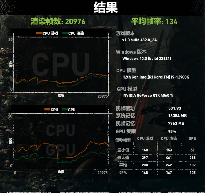 ▲在《古墓丽影:暗影》的1080P分辨率,光线追踪最高,DLSS 2质量模式下,iGame GeForce RTX 4060 Ti Ultra W OC 8GB能够提供134 FPS的平均帧率,同时,搭配i9-12900K时,GPU受限高达95%,建议使用i7-13700K或i9-12900K或对等的AMD CPU来搭配RTX 4060 Ti使用。