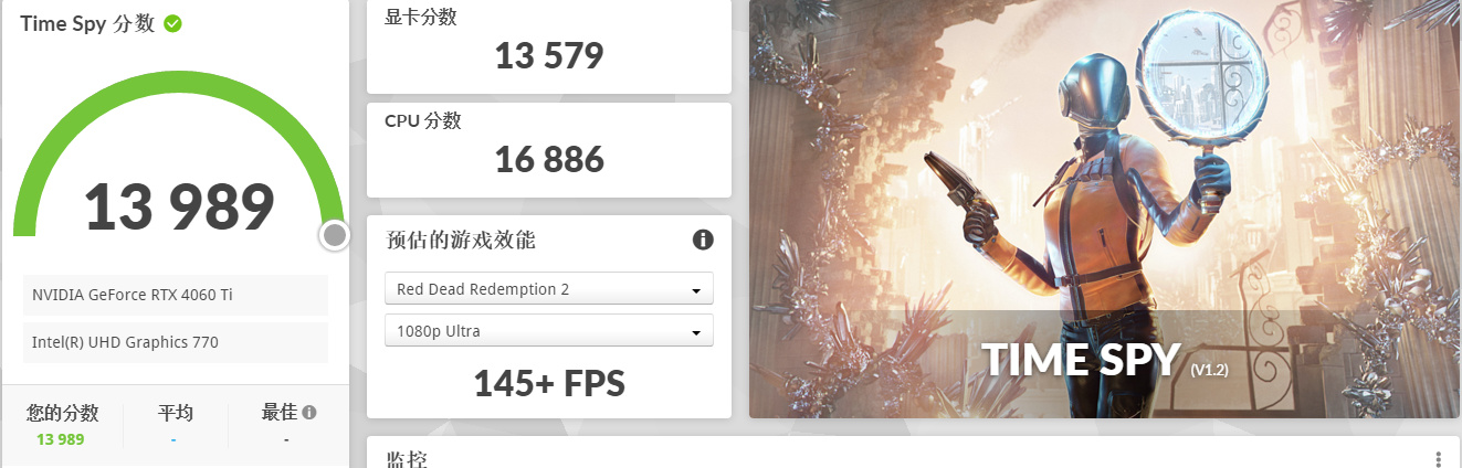 ▲在3D Mark Time Spy中,iGame GeForce RTX 4060 Ti Ultra W OC 8GB的显卡总分为13989分,显卡得分为13579分。其中显卡测试1平均帧率89 FPS,显卡测试2平均帧率 78 FPS,3D Mark预估在《荒野大镖客2》,1080P最高画质下可获得145+的平均帧率。