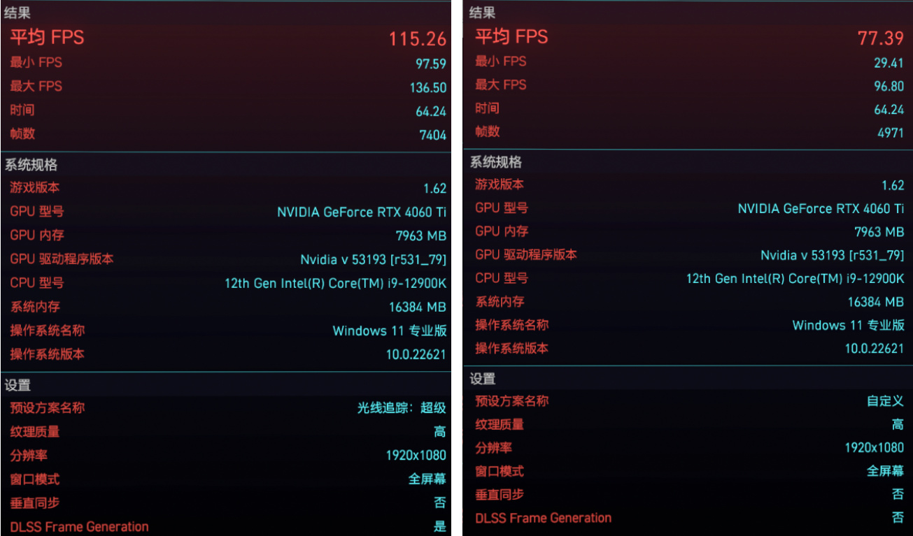 ▲紧接着我们测试《赛博朋克2077》,这款大作不仅支持光线追踪与DLSS 3技术,且在4月的大更新后还支持了光线追踪:过载画质,可以说是显卡杀手Plus版,我们一起在夜之城中测试一下这款显卡在开启DLSS 3时,相较于开启DLSS 2时能够提升多少帧率吧。