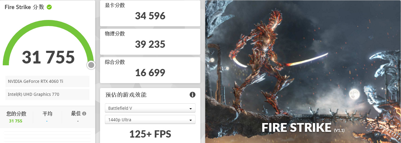 ▲在3D Mark Fire Strike中,iGame GeForce RTX 4060 Ti Ultra W OC 8GB的总分为31755分,显卡得分为34596分。其中显卡测试1平均帧率168 FPS,显卡测试2平均帧率136 FPS。
