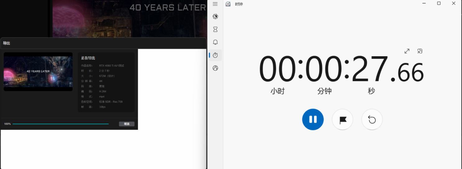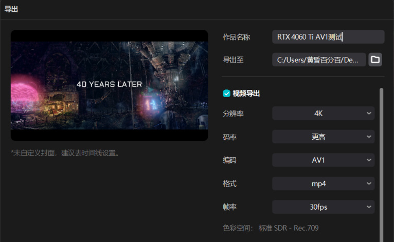 ▲本次测试重点集中在AV1的硬件加速上,硬件加速会大幅提升视频导出的速度,因此本次测试会分别在开启与关闭硬件加速编码的情况下,以4K 30FPS,更高码率,AV1编码格式分别输出两次视频,以比较RTX 40系显卡AV1编码硬件加速到底能降低多少输出时间。