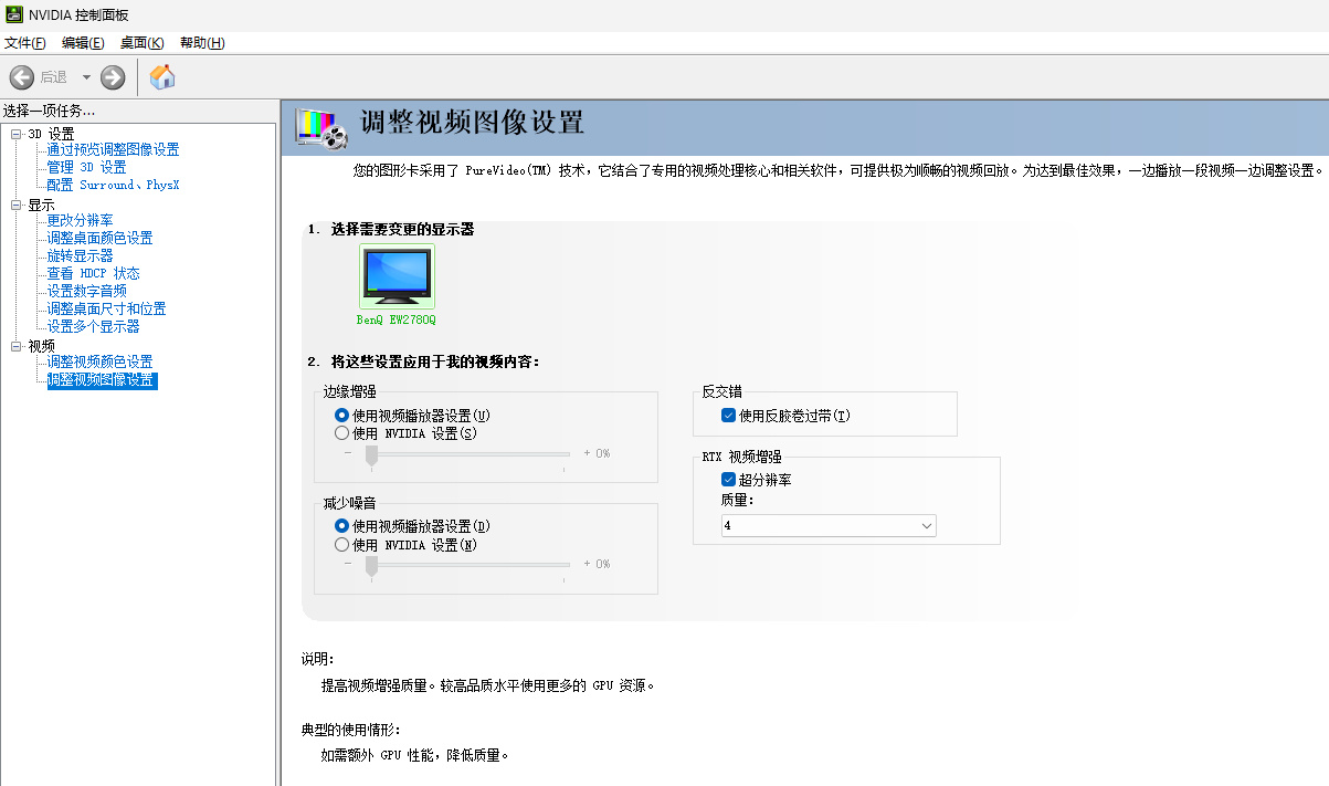 ▲RTX VSR视频超分辨率技术(即视频增强)是AI 图像处理的突破,它超越了传统的边缘检测和特征锐化技术,极大地提升直播视频内容的质量。使用RTX 40系与RTX 30系的朋友,仅需更新到最新的驱动,便可在NVIDIA控制面板中开启“RTX 视频增强”,目前质量有1~4共4个挡位,数字越高,效果越好。