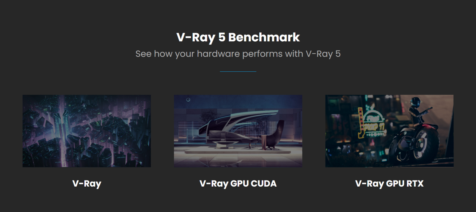 ▲首先我们使用V-Ray 5 Benchmark进行测试,这款软件内置了3个测评项目,分别为用于测试CPU的V-Ray测试,可以同时测试CPU与GPU的V-Ray GPU CUDA,以及考验显卡RTX渲染功能的V-Ray GPU RTX测试。