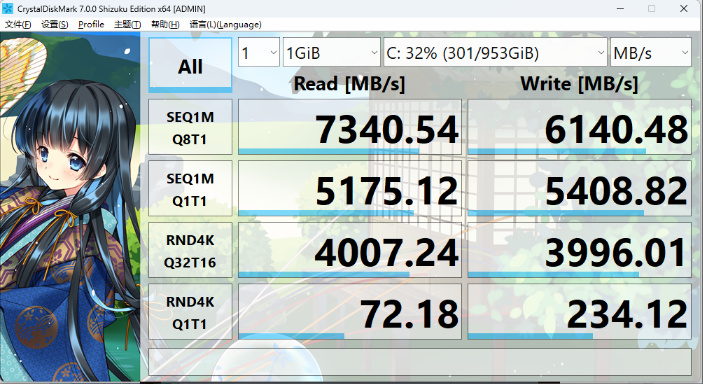 ▲官方标称GM7顺序读取7200MB/s,写入速度6300MB/s,实测其顺序读取7340MB/s,顺序写入速度6410MB/s,可以说宏碁产品的标称速度与实际速度基本无差异,这点必须好评,7300MB/s的顺序读取基本上跑满PCIe 4.0的理论带宽了,十分适合游戏玩家使用。