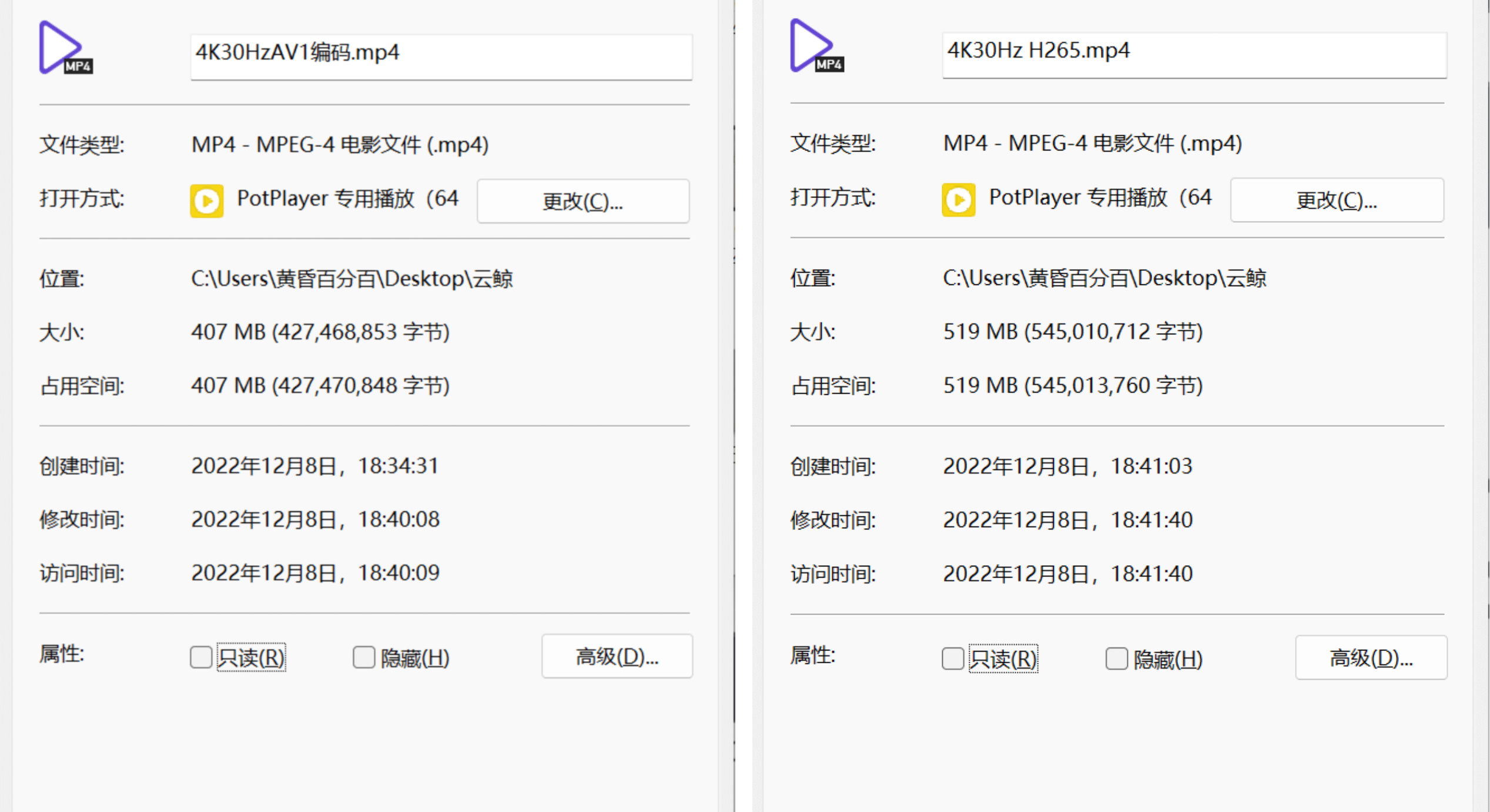 ▲简单比较一下同码率的4K视频,AV1编码的视频仅占407MB,相较于519MB的H265编码视频,瘦身了约27.5%,因此,AV1编码的视频更省空间或能更好的保留画质,因此更加适合内容创作者,目前国内的哔哩哔哩与爱奇艺均支持上传AV1编码的视频。