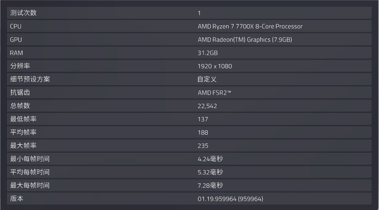 ▲在1080P 分辨率,预设超高画质下,AMD Radeon RX7600的平均帧率为188 FPS,可以轻松跑满1080P 160Hz的显示器,即使搭配1080P,240Hz的显示器也丝毫不虚。