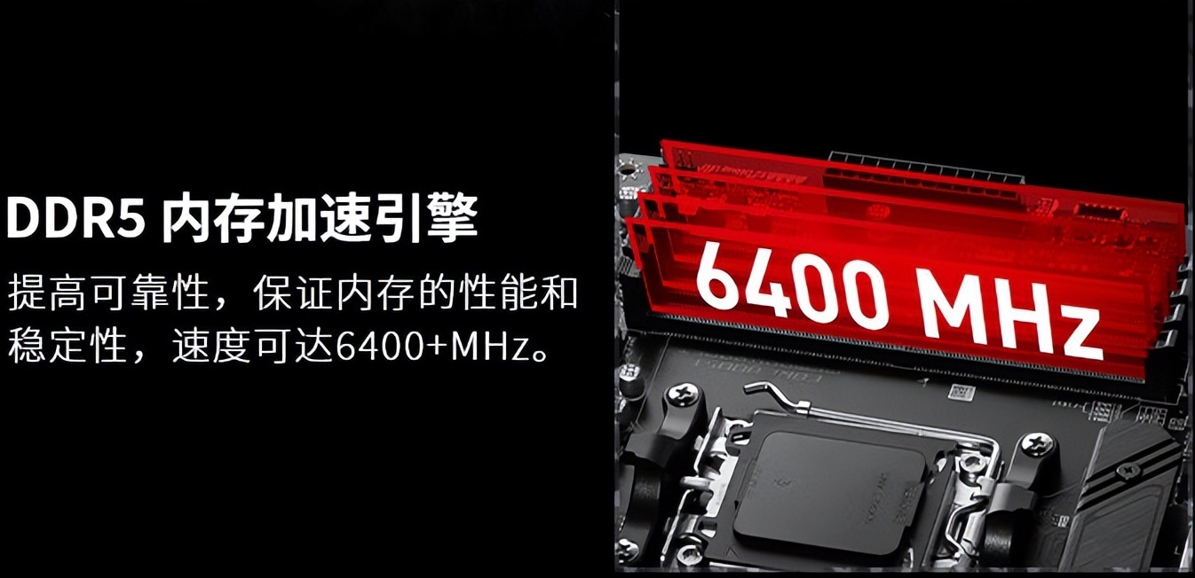▲这款主板还拥有DDR5 内存加速引擎,可以提升内存的性能与稳定性,速度最高可达6400MHz,完美覆盖AMD 锐龙7000系列CPU 6000MHz到6400MHz的内存频率甜点区间段。