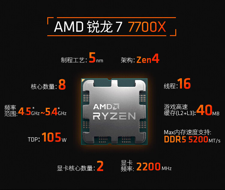▲今天使用的AMD 锐龙7 7700X是一款8核16线程的CPU,基础时钟频率4.5GHz,最大加速时钟频率5.4GHz,无论作为生产力工具还是游戏利器,都是一款性能十分强劲的CPU。