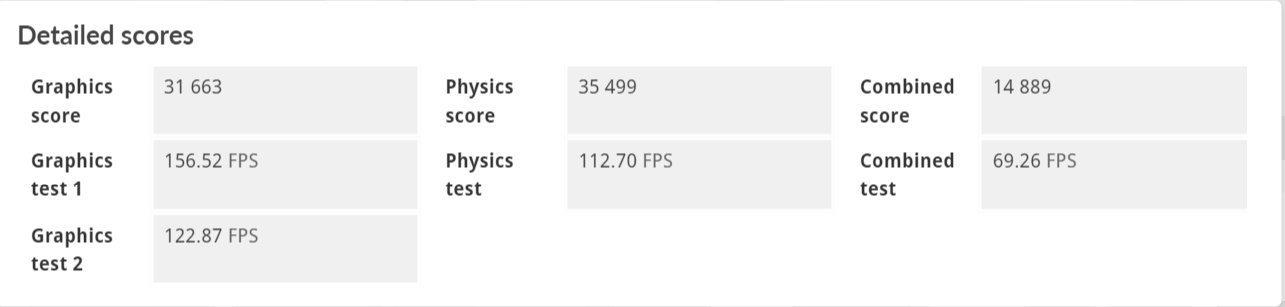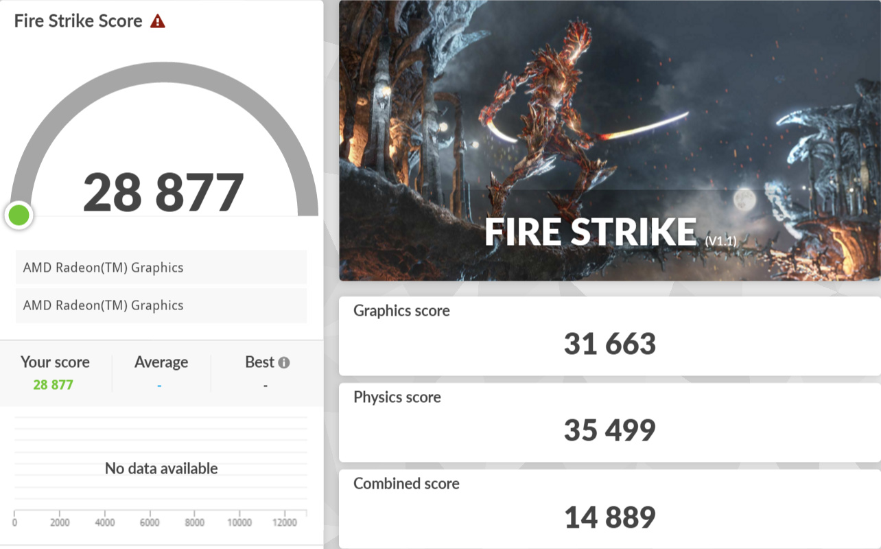▲在3D Mark Fire Strike中,AMD Radeon RX7600 的总分为28877分,显卡得分为31663分。其中显卡测试1平均帧157 FPS,显卡测试2平均帧率123 FPS。