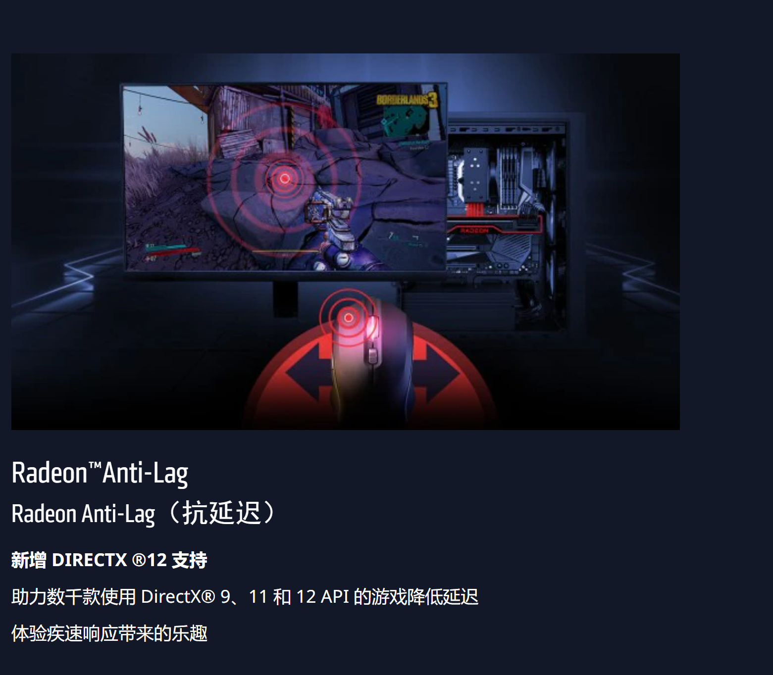 Radeon Anti-Lag(抗延迟)功能可以控制 CPU 工作的速度以确保不超过显卡太多,从而减少排队等待的 CPU 工作。 因此,Radeon Anti-Lag(抗延迟)可以将输入延迟缩短几乎一整帧,从而获得疾速响应的游戏体验。目前Radeon Anti-Lag技术已经新增对Directx 12游戏的支持。