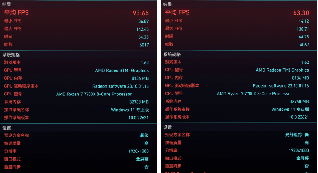 ▲在1080P分辨率,预设超级画质与预设光线追踪:低画质下,AMD Radeon RX7600在开启FSR 2时,平均帧率分别为94 FPS与63 FPS,均可以十分流畅的进行游戏。