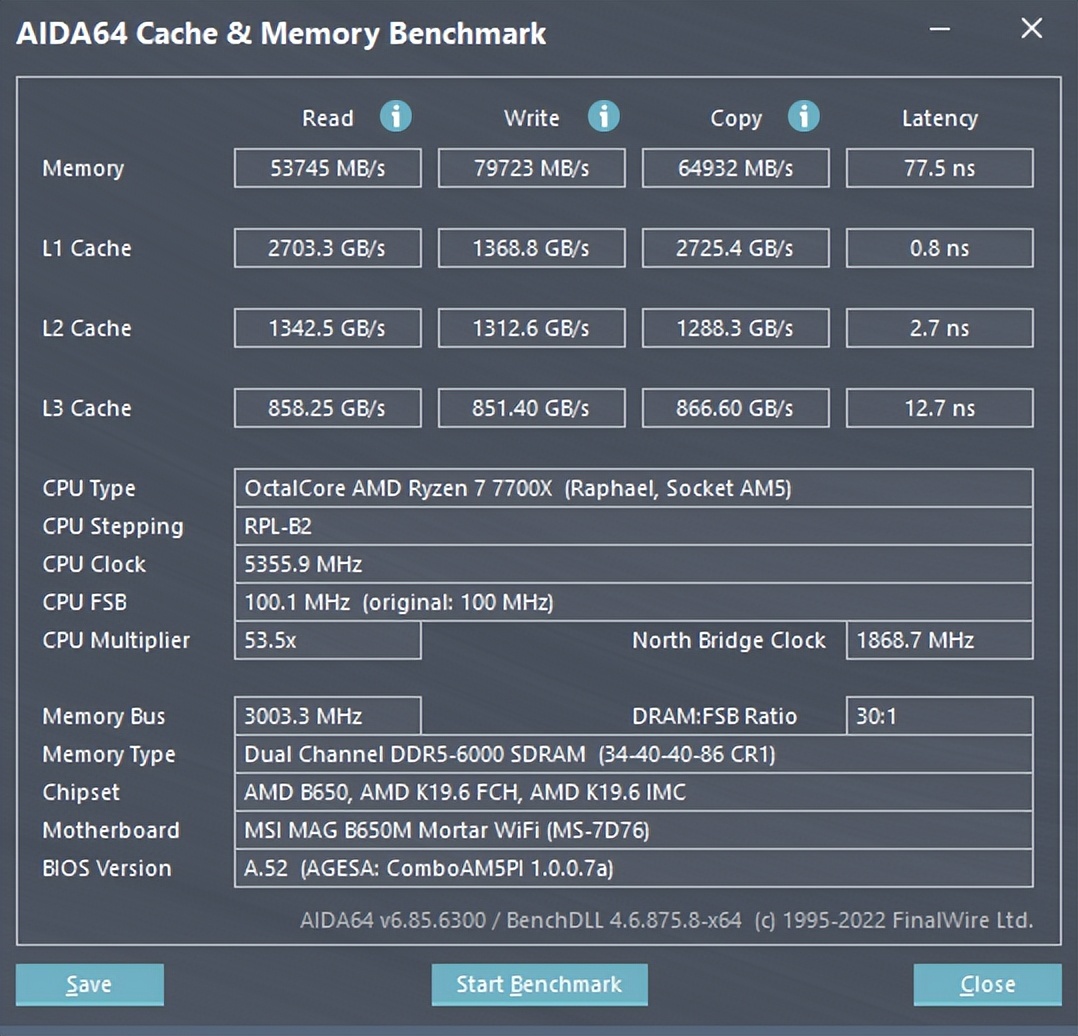 ▲经AIDA 64实测,Laxer雷克沙 ARES DDR5 6000MHz内存的读取速度为53745MB/s,写入速度为79723MB/s,复制速度为64932MB/s,延迟仅为77.5ns,符合DDR5内存在AMD 主板下的预期表现。
