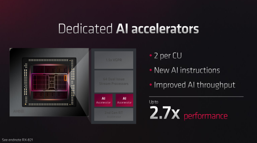 ▲AMD极大的增强AI加速,提高了常用的AI运算指令的吞吐量,同时将这些运算指令紧密地结合到统一的计算单元当中,提供了超过2.7倍的AI性能的提升,让RDNA 3可以利用当前的硬件单元来实现未来的人工智能要求。