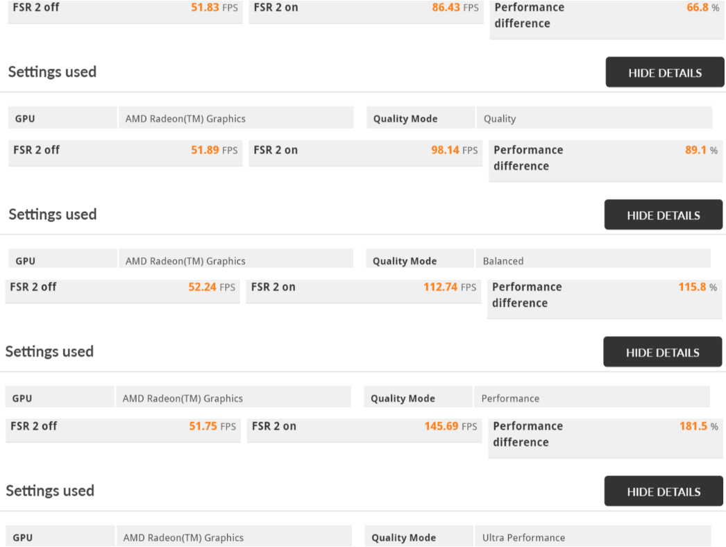 ▲经实测,在1080P分辨率下,未开启FSR功能时,游戏的平均帧率约为52 FPS,开启FSR质量模式/平衡模式/性能模式/超级性能模式下时(顺序由上至下),平均帧率分别为86 FPS / 98 FPS / 123FPS / 146 FPS,帧率提升由66.8%到181.5%不等,可见 FSR对游戏帧率的提升还是很立竿见影的。