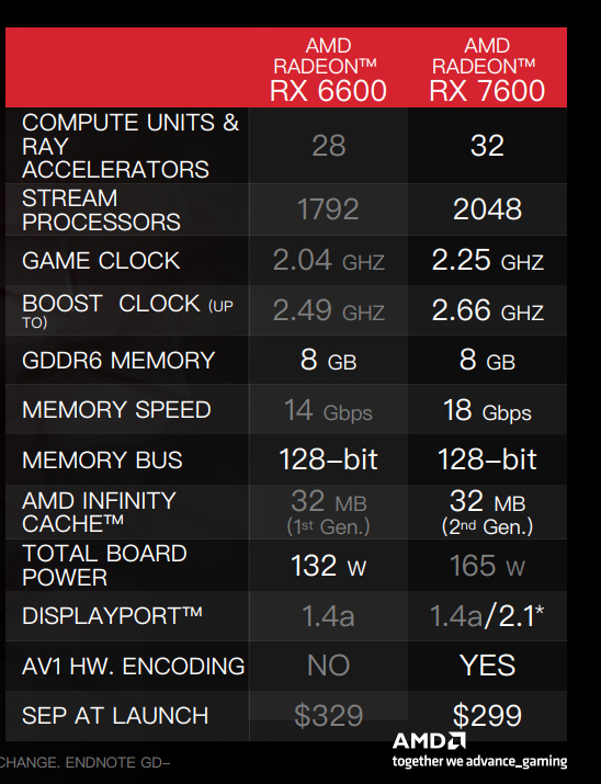 ▲简单而言,AMD Radeon RX 7600拥有32个RDNA 3计算单元,2048个流处理器,基础核心频率2.25GHz,最大可超频至2.66GHz,搭配了8GB 128bit的GDDR6显存与32 MB第二代Infinity Cache,参数方面相较上一代的AMD Radeon RX6600均有比较明显的提升,而总功率却仅有165W。
