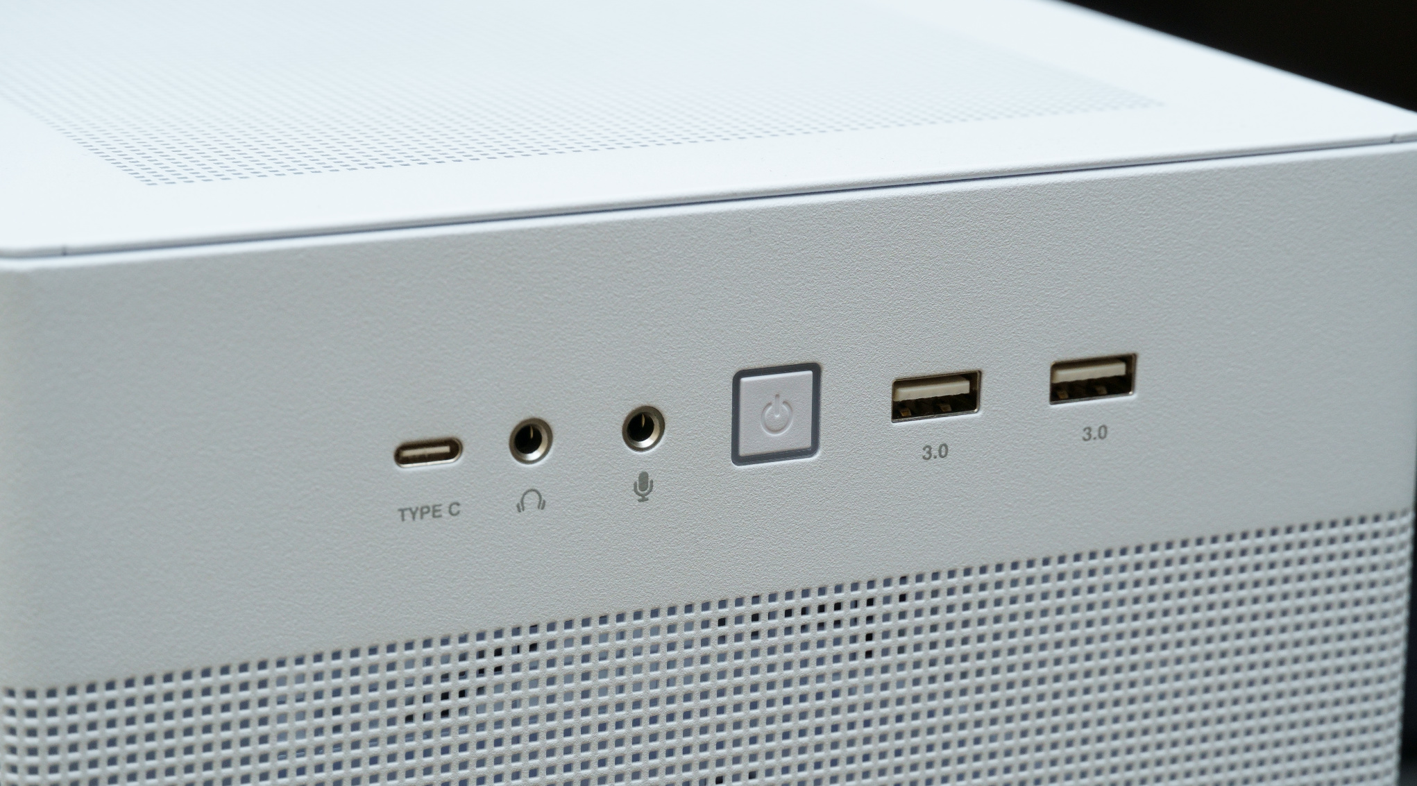 ▲冰立方的IO面板设置在的正面,这样做的好处是可以避免猫卧在机箱上时误触电源键导致电脑意外关机(我家猫把电脑按关机之后发现我生气,还能马上把电脑按开机,就离大谱。。),AP201配置了USB 3.0接口2个,Type-C接口1个,3.5mm耳机接口与3.5mm麦克风接口各一个,值得注意的是AP201的USB 3.0接口并没有采用USB-IF建议的蓝色,而是使用了与机箱一致的白色,这个细节值得表扬。