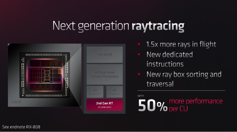 ▲在光线追踪方面,通过新的着色器指令集以及针对Ray Box Sorting(Ray Box排序)和traversal(遍历)多项的优化,让每个计算单元的光追性能能够提高高达50%。