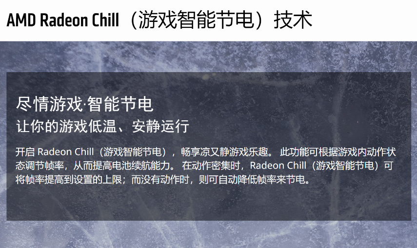 AMD RADEON Chill技术是可以根据游戏场景主动调节帧率,从而达到节电的目的,说实话的,台式机玩家真的不差那丢丢电费,这个技术更适合用于为笔记本电脑与搭载AMD APU的掌机延长续航使用,最近连ROG都下场做掌机了,相信这个功能会越来越普及,不过今天我就不在这里做过多扩展了。