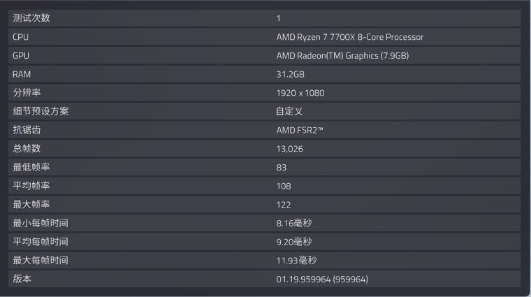 ▲在1080P 分辨率,预设超高+光追高画质下,AMD Radeon RX7600的平均帧率为108 FPS,依旧十分流畅。