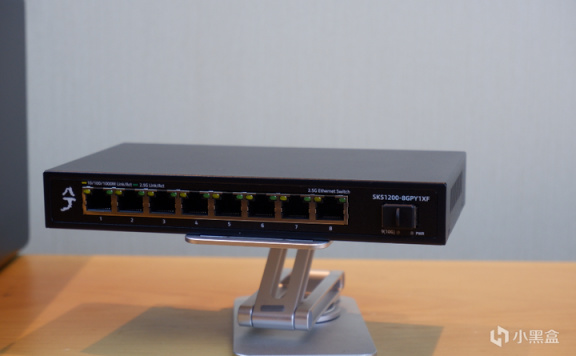 SKS1200-8GPY1XF万兆上联交换机,左侧兮克logo十分醒目,配备8*2.5G交换电口,右侧单个SFP+万兆光口。左侧电口速率灯10/100/1000为黄色,2.5G为绿色,右侧万兆口下方绿色灯亮起为10G 速率模式。