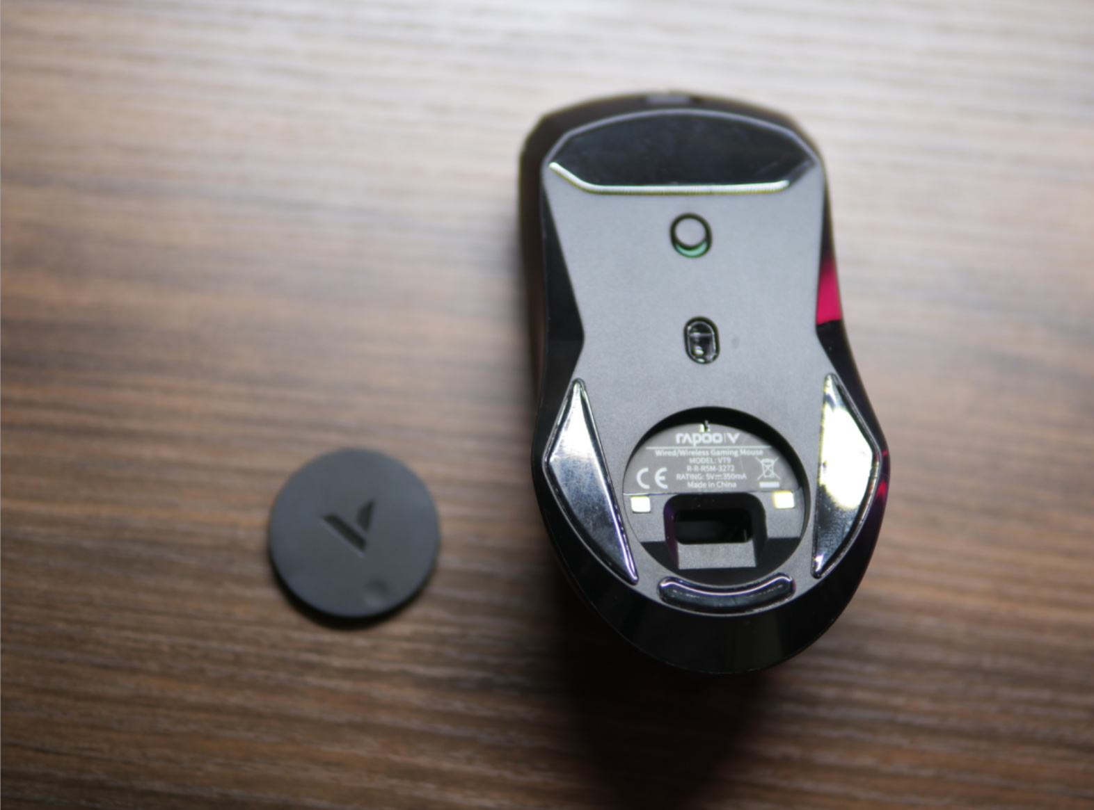 两者均内置2.4g接收器的收纳位置,多彩是依靠模具卡住接收器,而雷柏VT-9则是在一个盖板下面,磁吸在里面的。值得一提的是,多彩宣称重量68g实测70g,雷柏VT-9宣称78g实际76g而且接收器盖板拿下来也不影响使用,此时重量为74g。